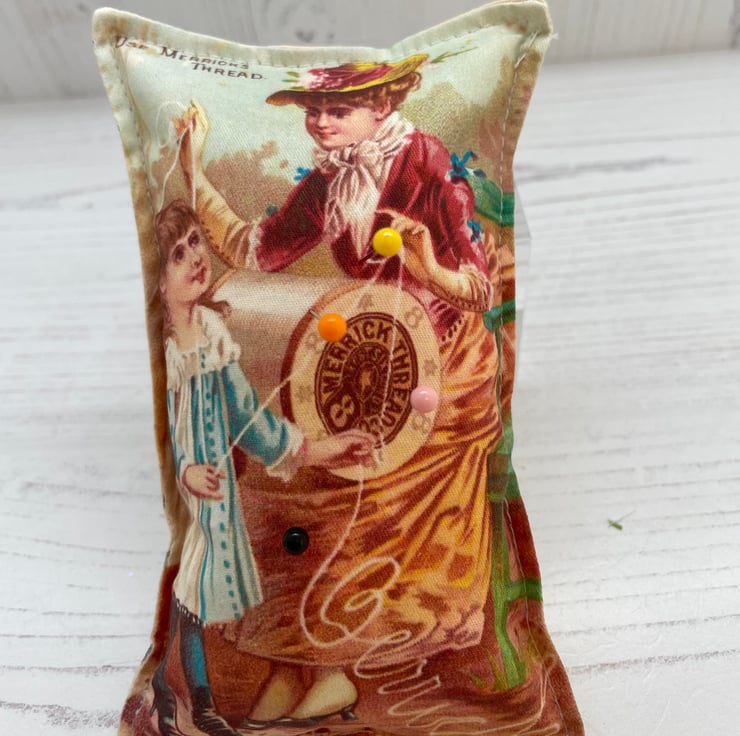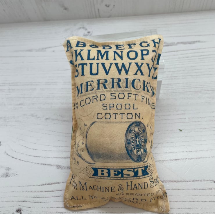 Vintage trade image printed onto non wash cotton with a vintage spool image on the back. Filled with rice and poly fibre filling. The weight of the rice stops the cushion flying off your sewing table, very annoying.