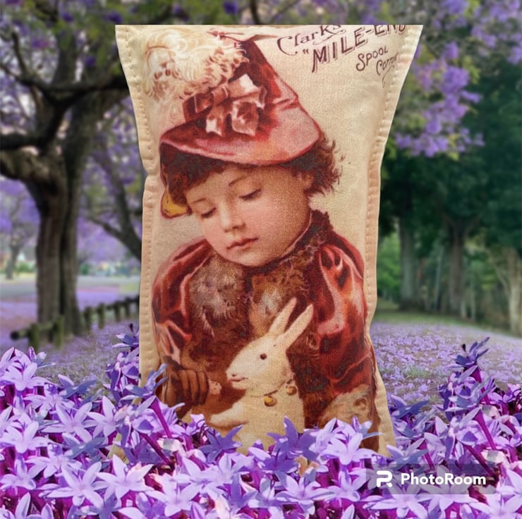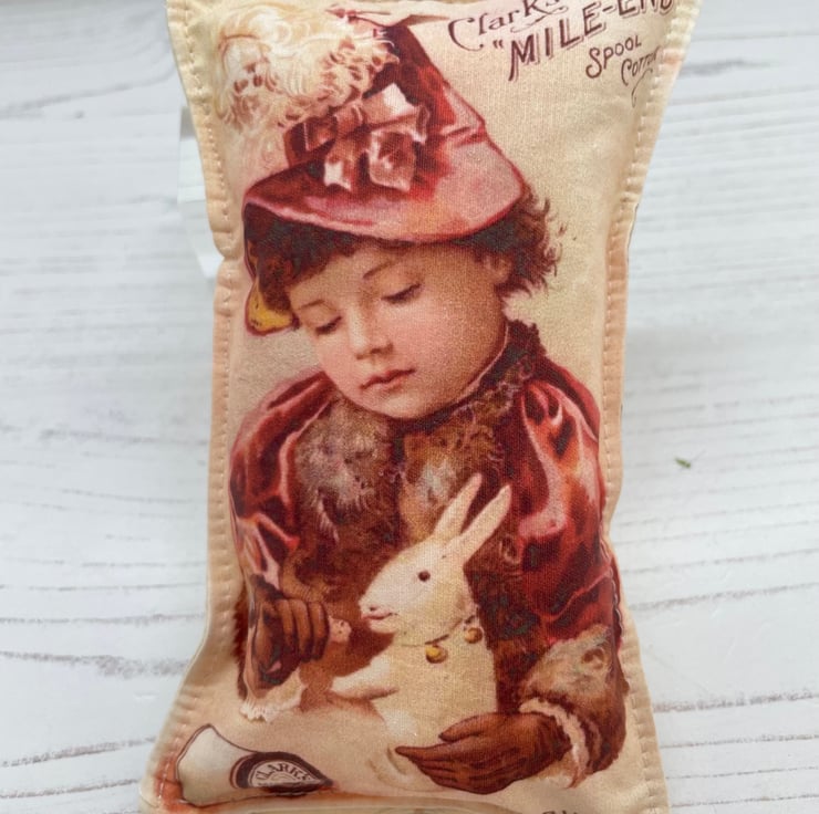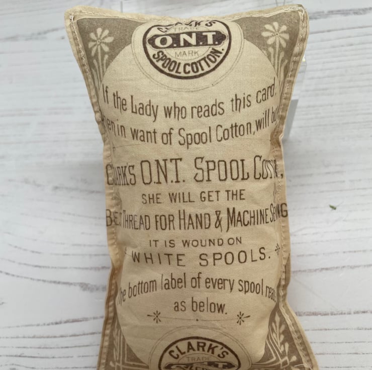 Vintage trade image printed onto non wash cotton with a vintage spool image on the back. Filled with rice and poly fibre filling. The weight of the rice stops the cushion flying off your sewing table, very annoying.