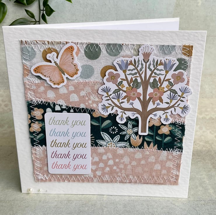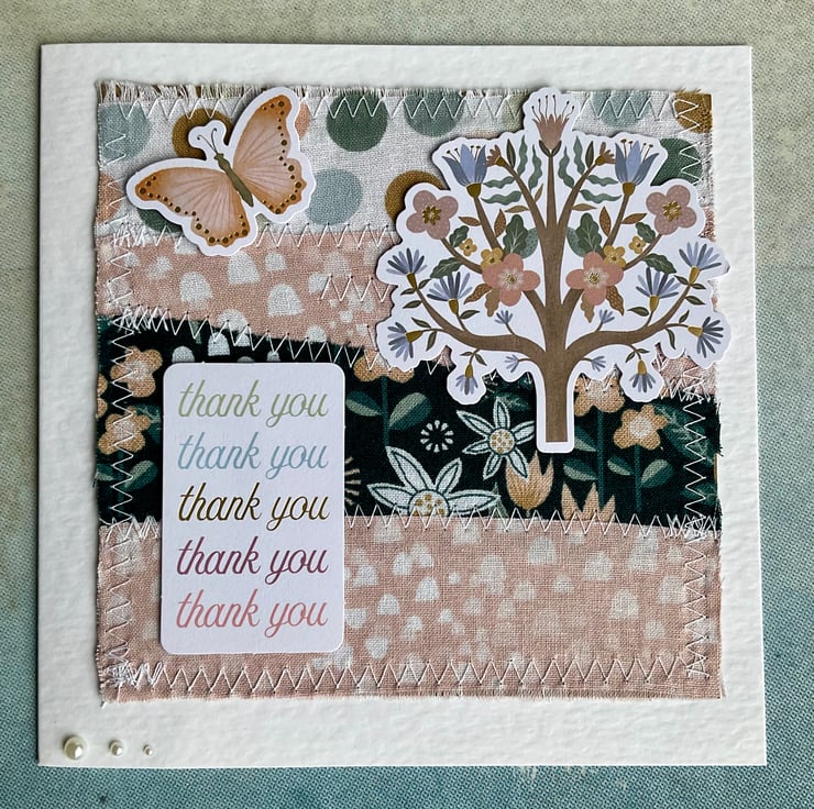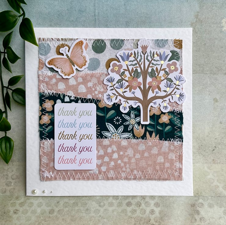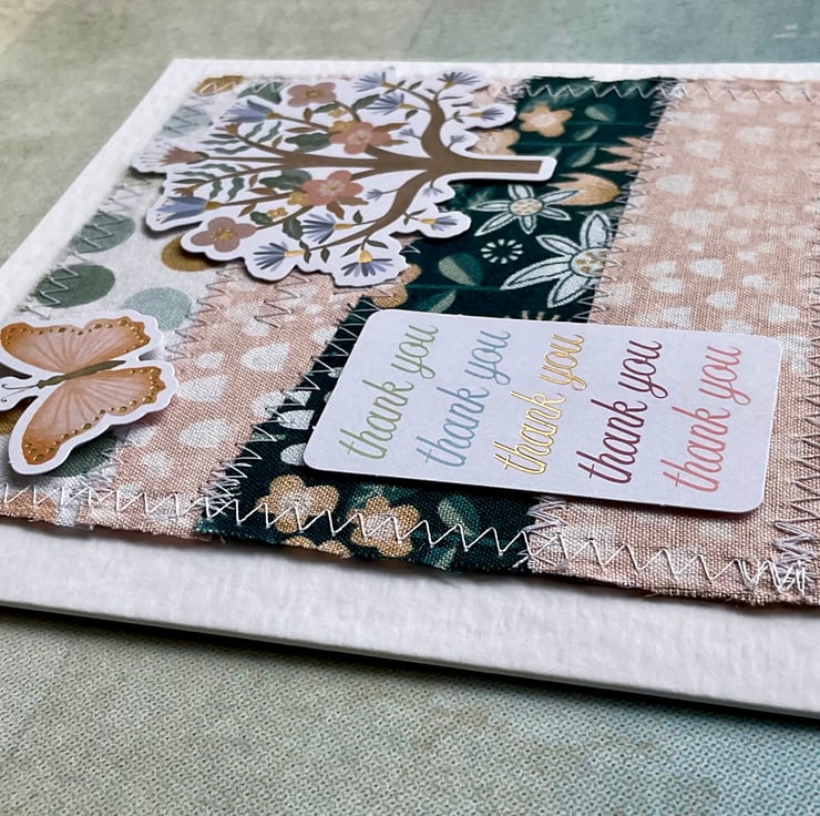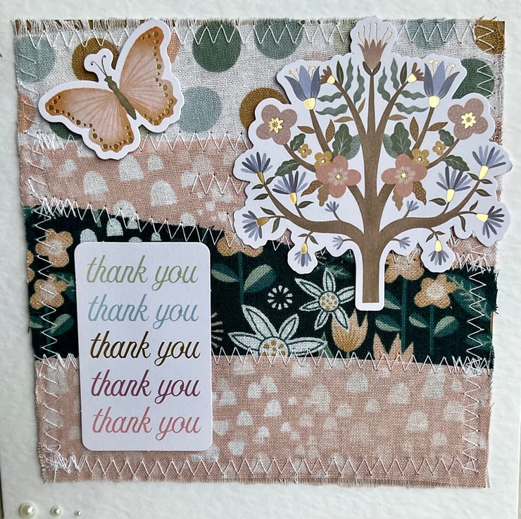 This has been embellished with die cut card toppers featuring a floral tree, a butterfly and the words thank you in colours that coordinate with the background.