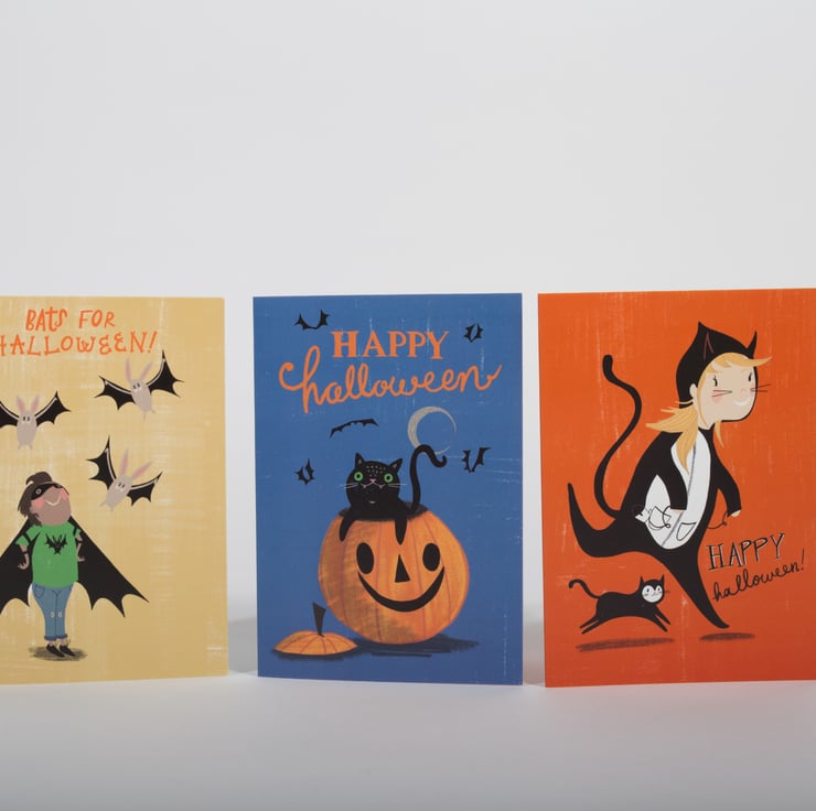 You could send this set to your spooky-season loving friends this Halloween, or to put on a wall to decorate for a Halloween party. Each card is blank on the inside for your own message, comes with an envelope and is printed on heavyweight card in the UK.