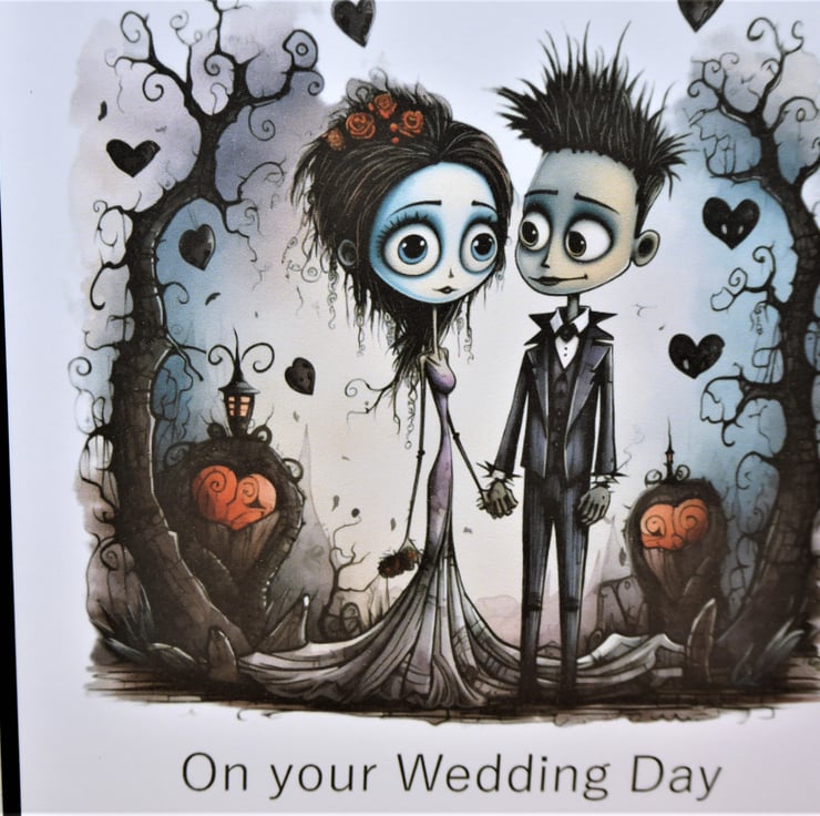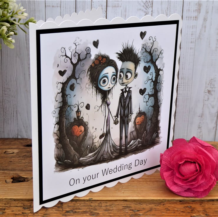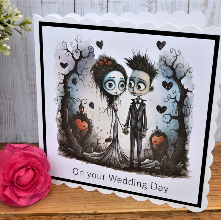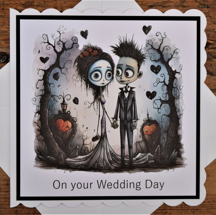 Lovely Zombie Wedding Card made from 300gsm white scalloped card. Printed image onto white card and added a sentiment. Layered up onto black card before completing.