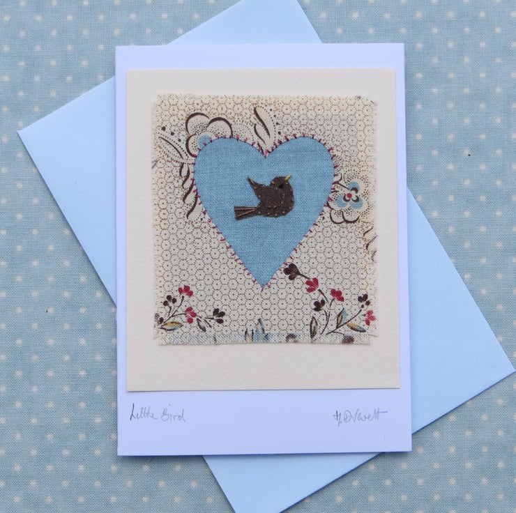 I think there is something heart-warming about hand-stitched things, and I try to combine colours and shapes in my designs to bring out that cosy and loving feeling, especially when making my cards. This little heart with bird design would be perfect for any number of special times and would make a lovely gift for someone else to send.