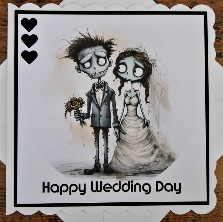 Cute Zombie Wedding Card made from 300gsm white scalloped card. Printed image onto white card and added a sentiment. Layered up onto black card and added 3 small black hearts to complete.