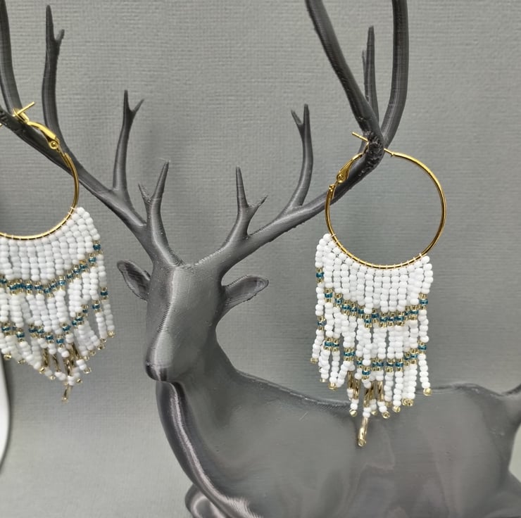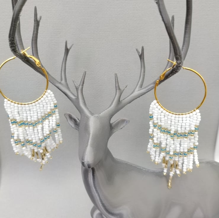 Gold plated hoop earrings with miyuki japanese glass seed beads with gold twisted bugle beads and blue and gold seed beads in fringe. fringe drop length 5cm. Will come gift packaged