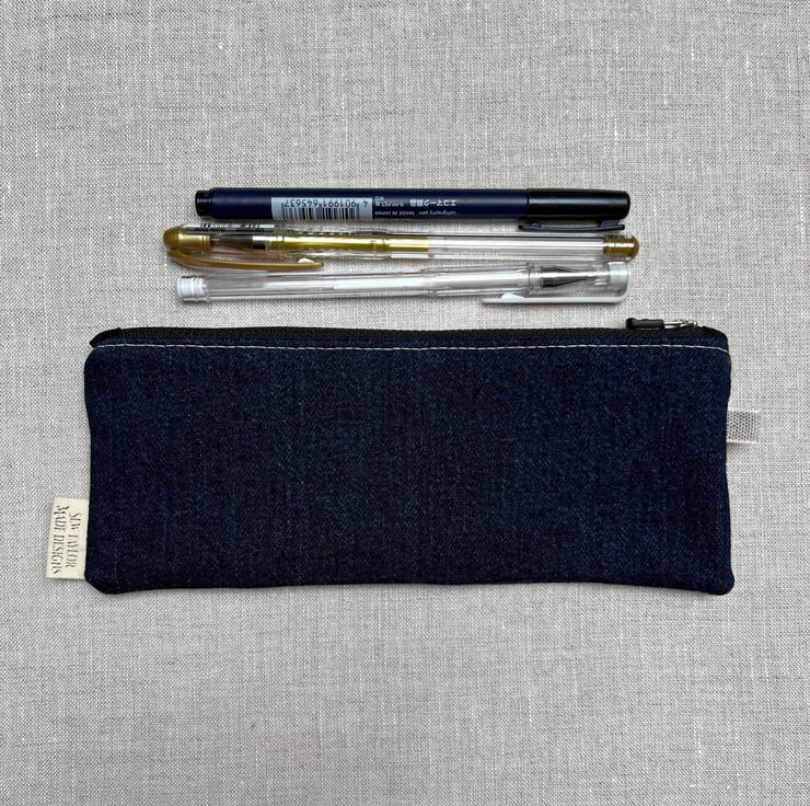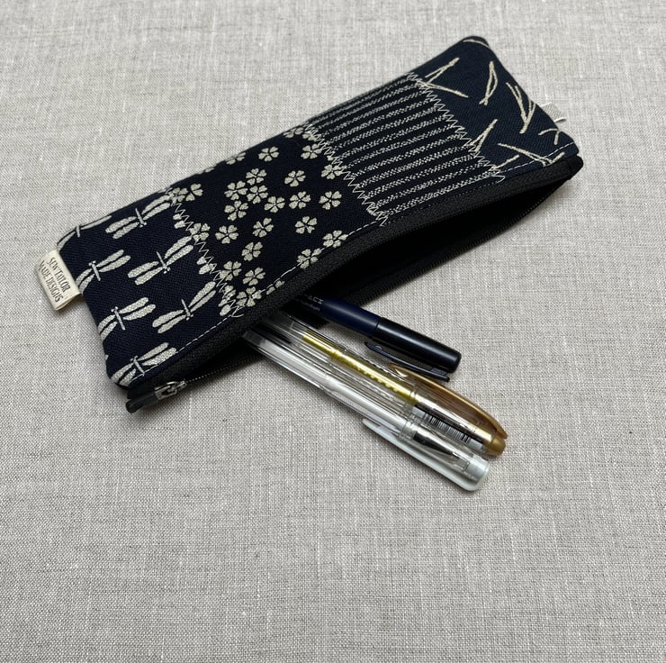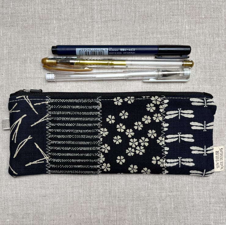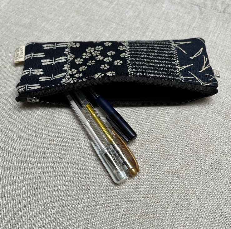 A timeless pencil case or pouch crafted from a patchwork of indigo Japanese cotton fabrics that feel like linen to touch. The patterns include pine needles, stripes, blossoms and dragonflies. The more that the pencil case is used the softer the fabric becomes. The back of the case is a dark denim.