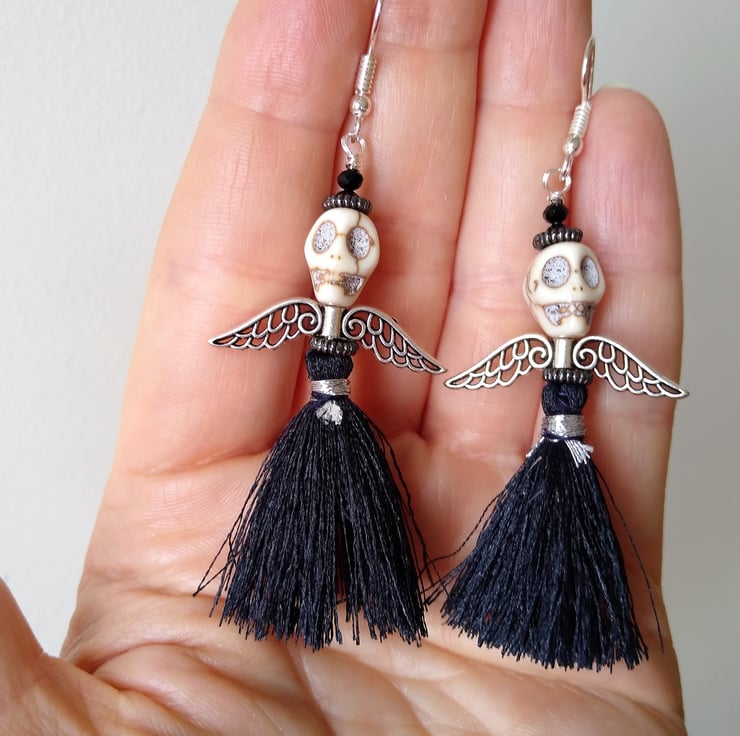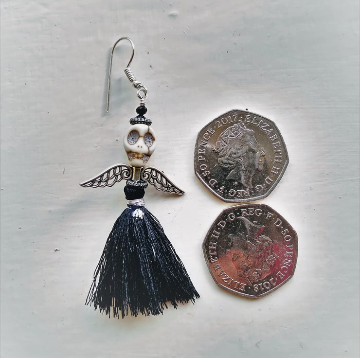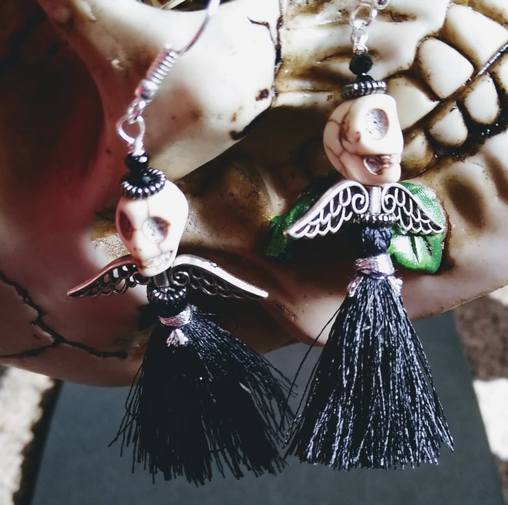 Embrace the dark with these striking black tassel skull angel earrings, perfect for Halloween. The earrings are hand made using a howlite skull bead, silver metal angel wings, faceted glass beads and a black nylon tassel all suspended from a silver plated ear wire/hook. The total drop of the earring is 3 inch or 75mm approx.