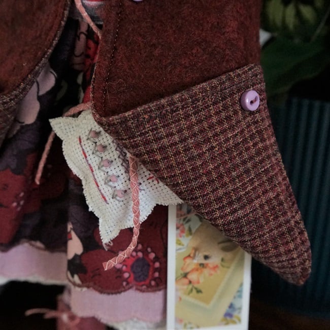 She is softly stuffed with rose petals in her stuffing for a gentle scent and she has a tiny garnet crystal at her heart for love. She has a brass ring to her back in case you want to place her on the wall.