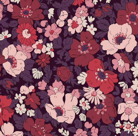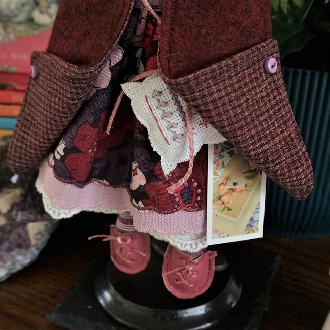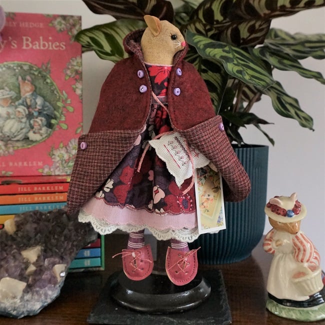 This is Blackcurrant, a tiny brown harvest mouse. She is a hand embroidered mouse with little leather ears and tail. She is dressed in a burgundy lined wool felt cape over a berry print cotton dress by Liberty called Cosmos Flower from the Botanical Jewels collection. She has coordinating underskirts and cotton lace bloomers. Her dress and cape are finished with organza ribbon, tiny buttons and little leather shoes.