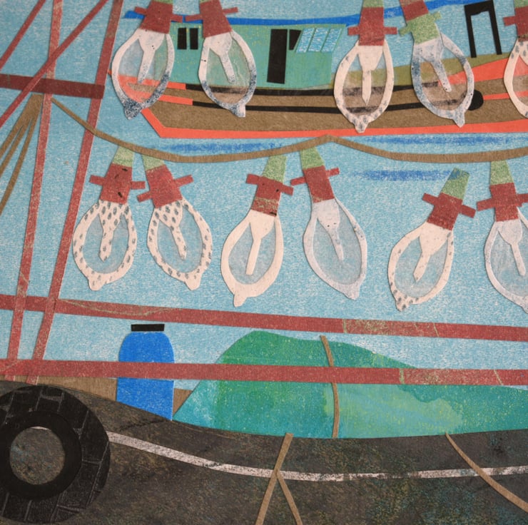 The collage was created from handprinted papers - carefully selected and snipped from other lino prints and mono prints.