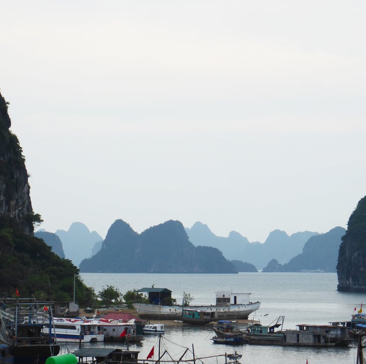 A couple of years ago we took a bus trip from Hanoi to the coast for a boat trip around the stunning karst islands in Ha Long Bay. Unfortunately a storm was approaching, the sea trip cancelled and we had to take in the view from the dockside.
