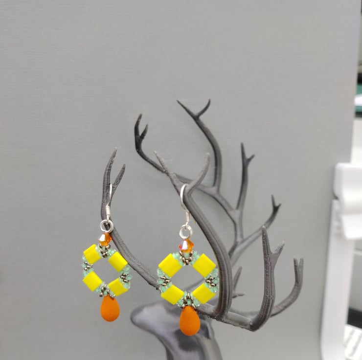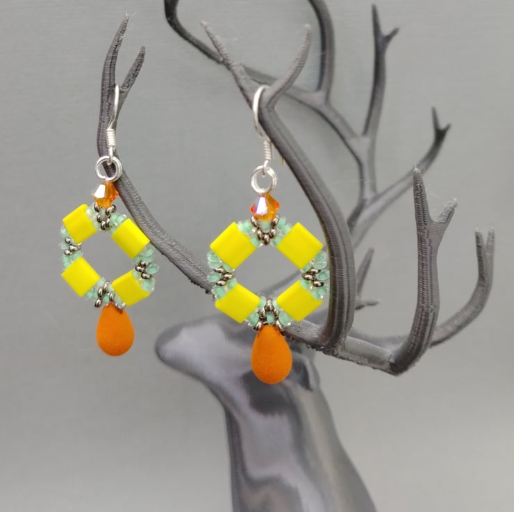 Silver plated yellow Tila beaded earrings with silver and green miyuki seed beaded spacers also presciosa crystal in orange with glass orange pear shaped drop bead length 3cm. Will come gift packaged