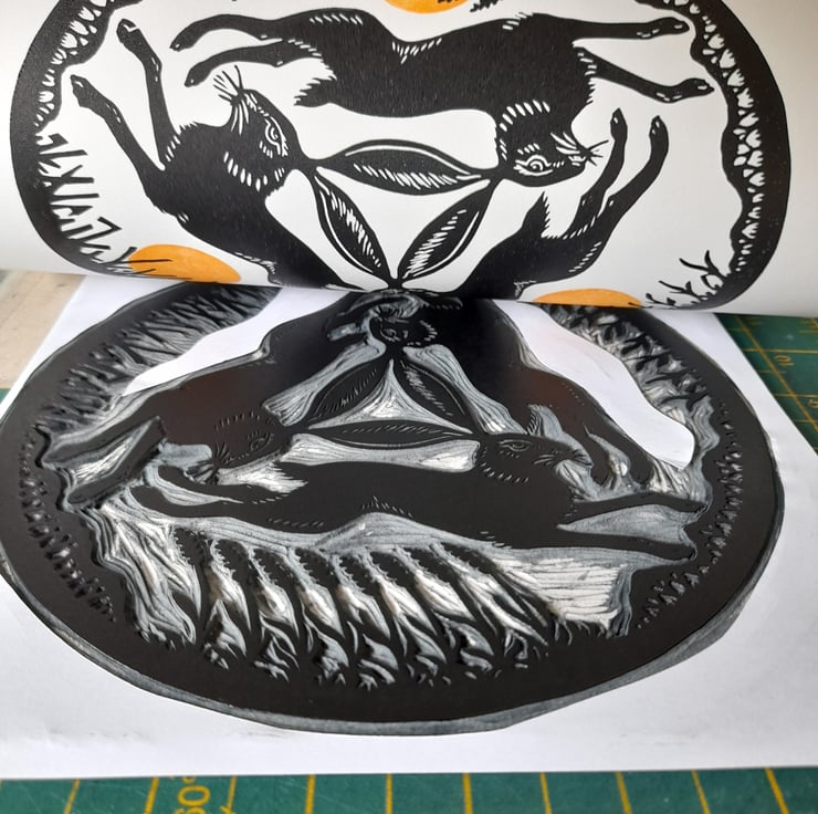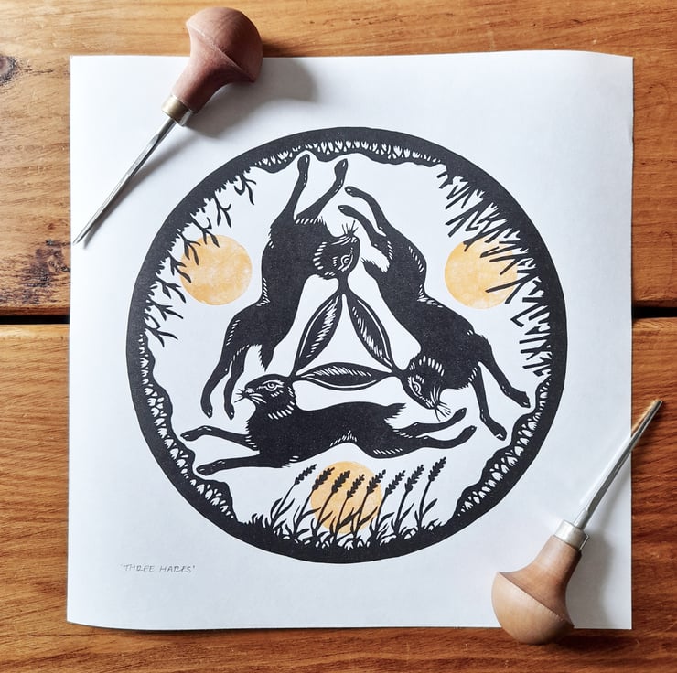 'Three Hares' is a two colour original linocut, printed by hand in rich black and burnt orange ink. It features the three hares motif, also known as Tinners' Rabbits, running in an endless circle in the British countryside.