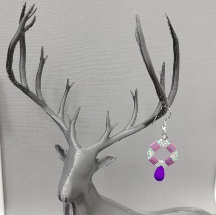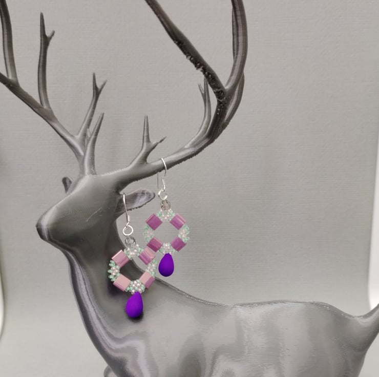 Pink lilacTila beaded earrings with purple pear shaped glass drop bead with pale green and pink spacers with silver plated shepherd hooks. Drop length 3cm and will come gift packaged