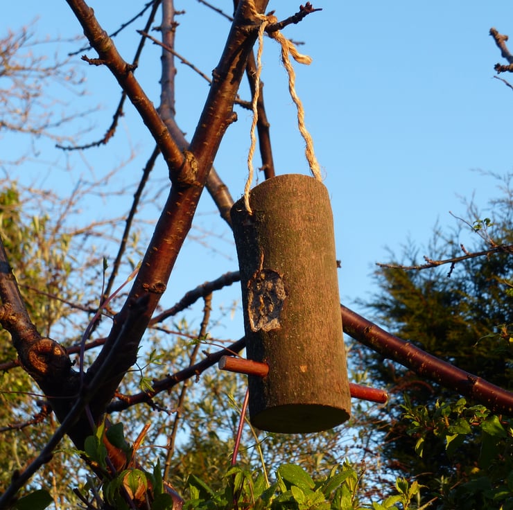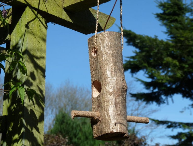 A rustic bird feeder complete with perch and string loop
