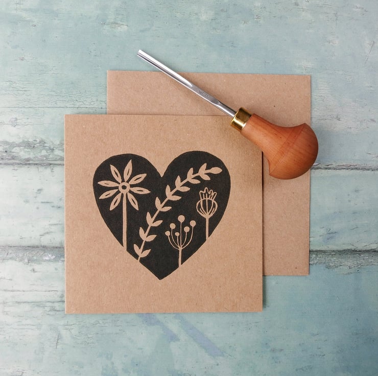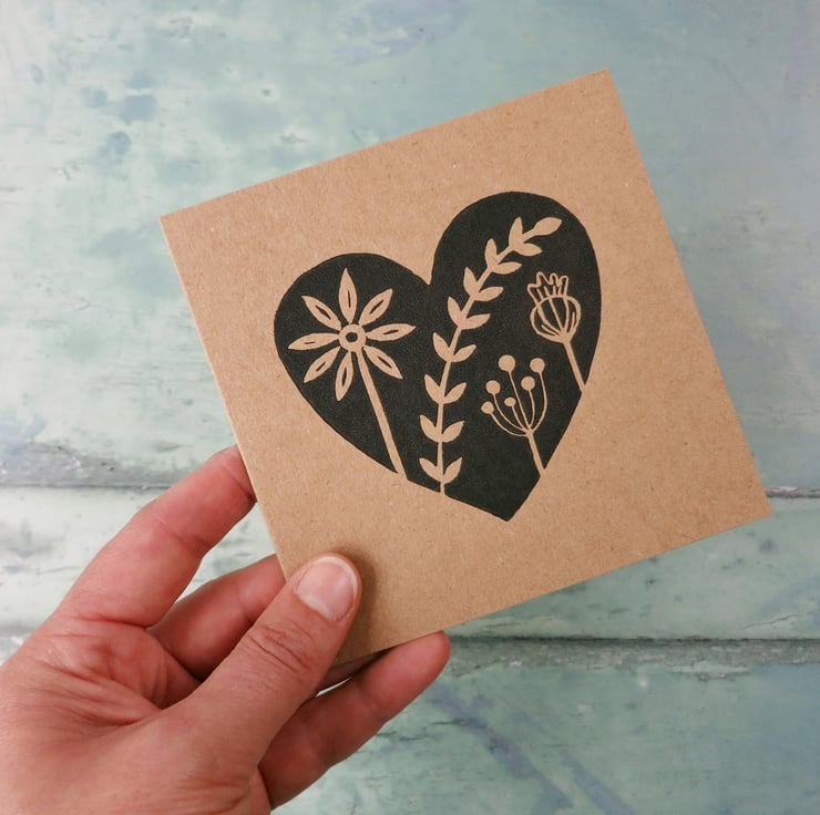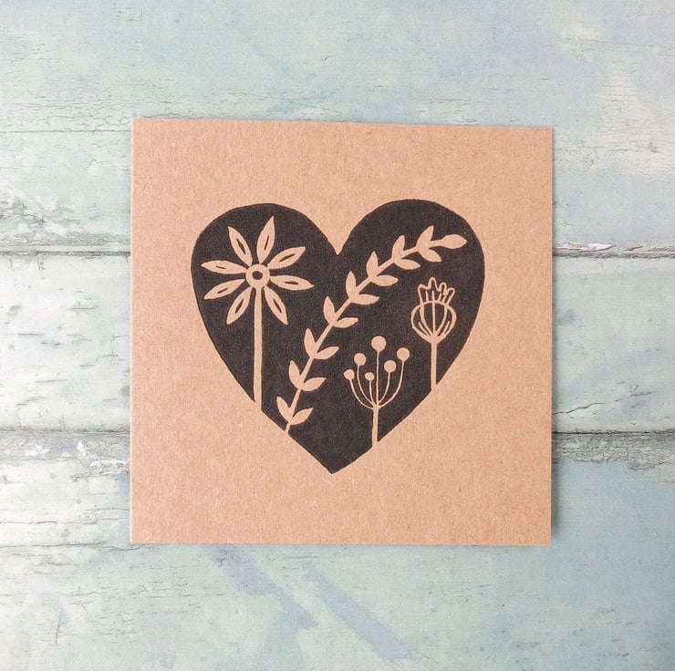 Original Lino print of a Floral Heart. Hand printed on recycled Kraft card using water based ink.