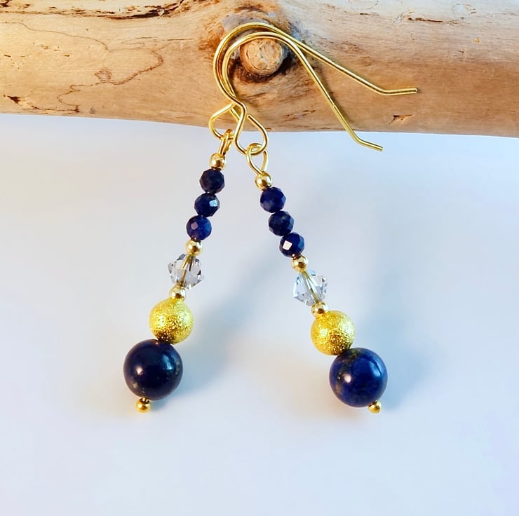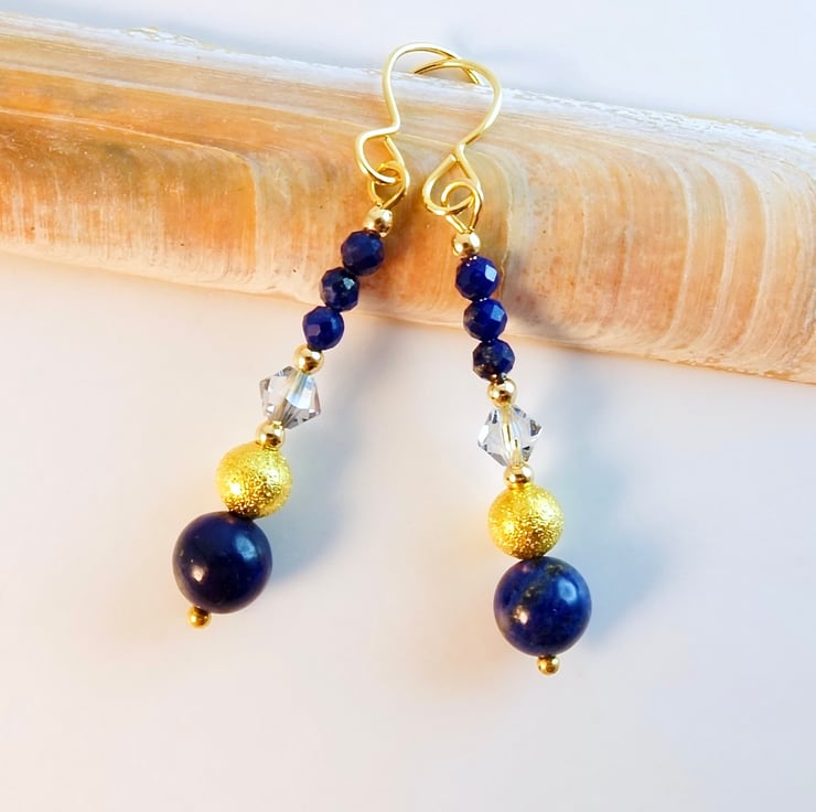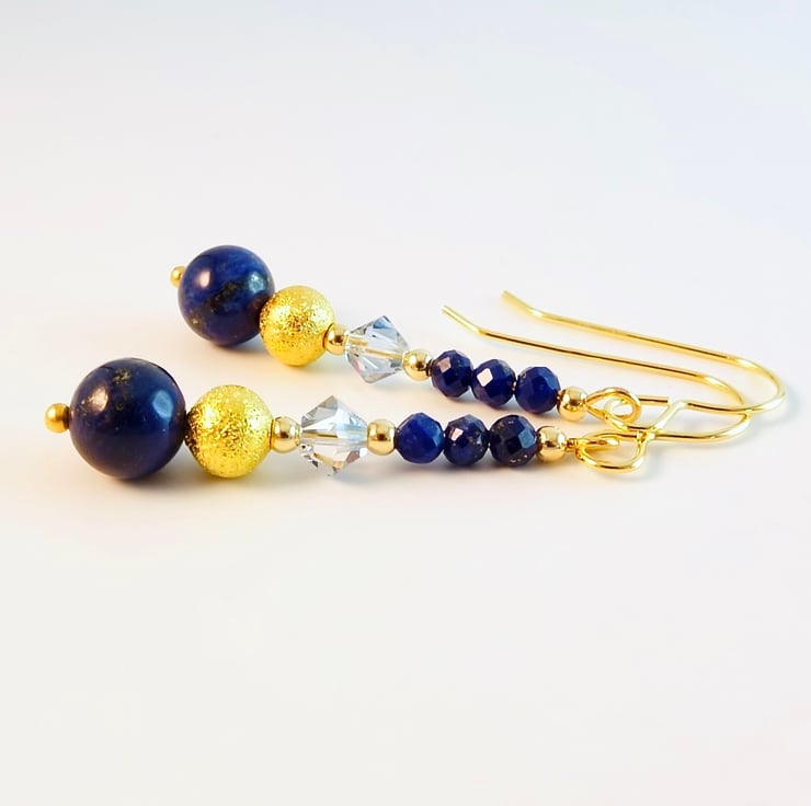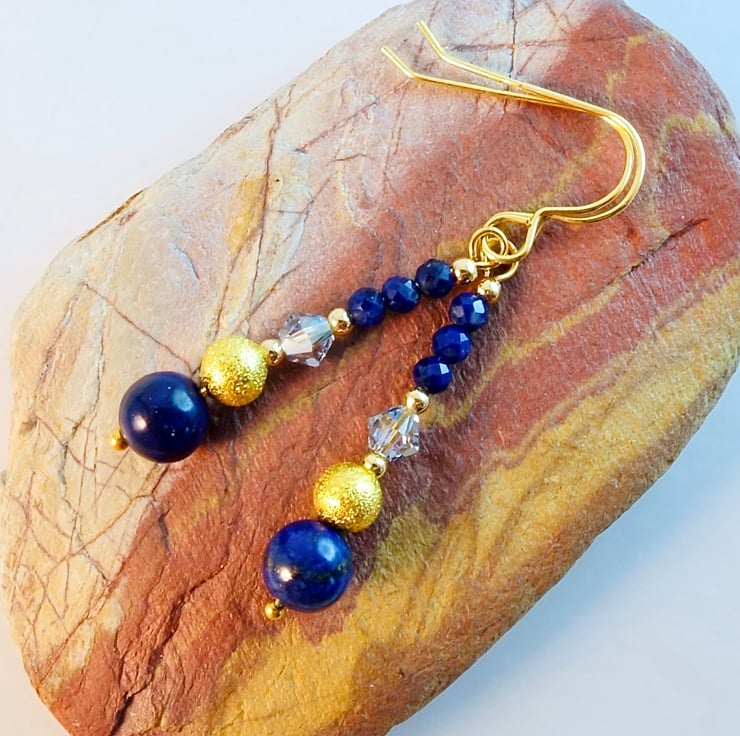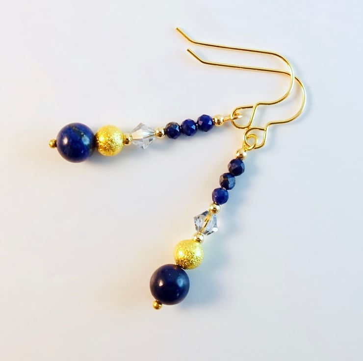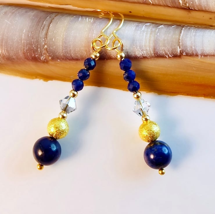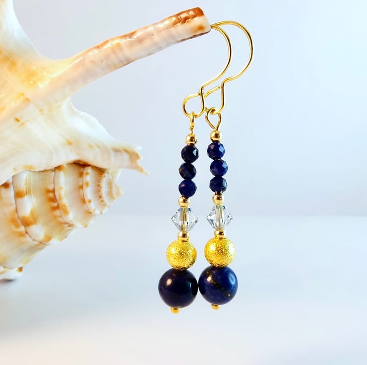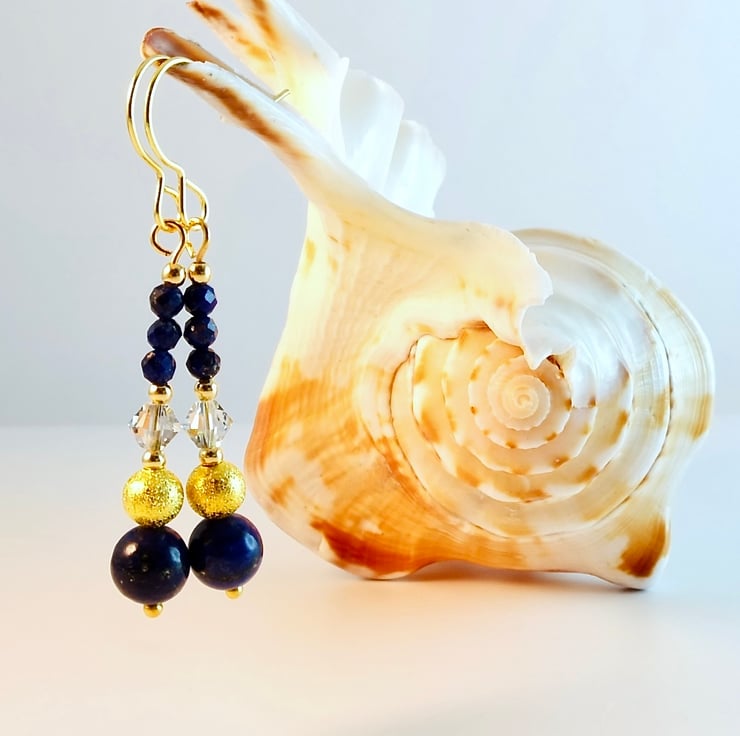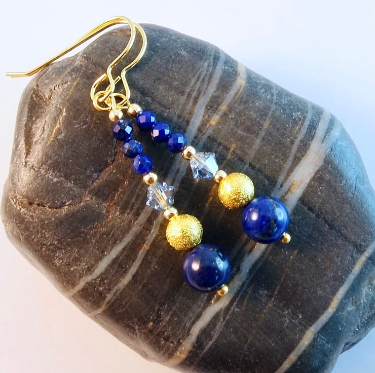 Each of these sparkly drop earrings features a 6mm Lapis Lazuli bead topped with a 5mm gold plated stardust bead, 4mm Swarovski 'blue shade' bicone and a trio of AA grade micro-faceted Lapis Lazuli rondelles.