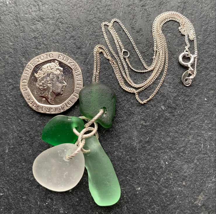 Twisted Sterling silver rings link the seaglass together adding sparkle between the green glass pieces. The cluster measures approx 3.7 cm and is attached to a Sterling silver extendable 18 to 20in chain.