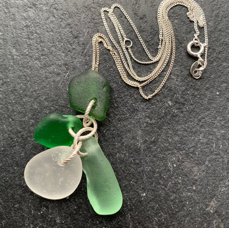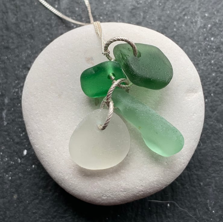 Four pieces of seaglass have been selected to make an ombre cascade pendant moving through 3 shades of green to finish with a piece of white seaglass. All pieces were found on Withernsea beach in East Yorkshire.