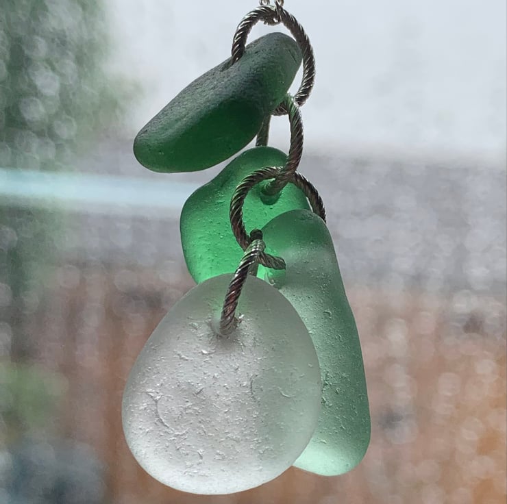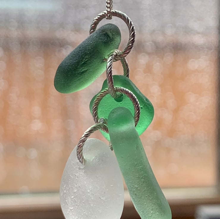 I try to make pieces that show the seaglass off. Cascade pendants that use small pieces can show the colours beautifully that a single small piece may not. This ombre cluster cascade moves through green hues from dark through to no colour. Hope you enjoy.