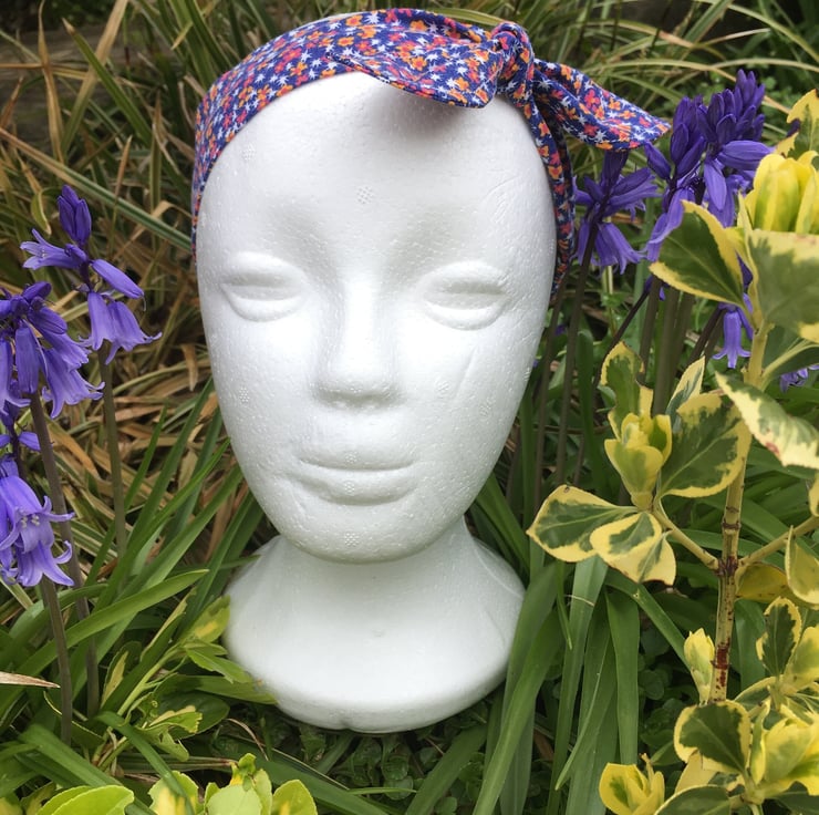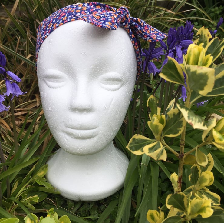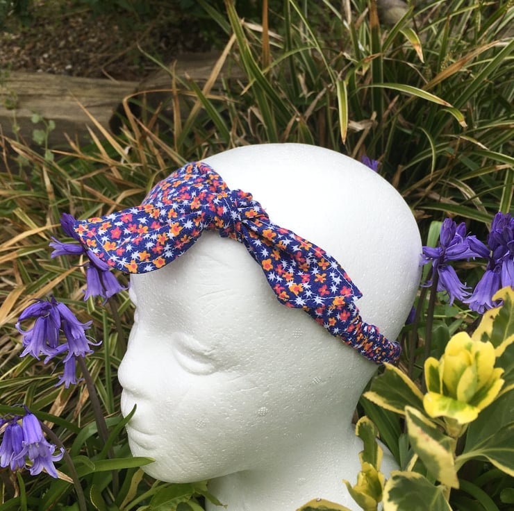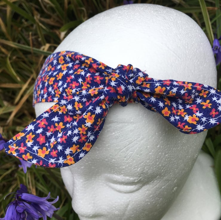 A headband handmade using repurposed vintage fabrics often including original seams, stitching and sometimes showing the age of the fabric in parts.