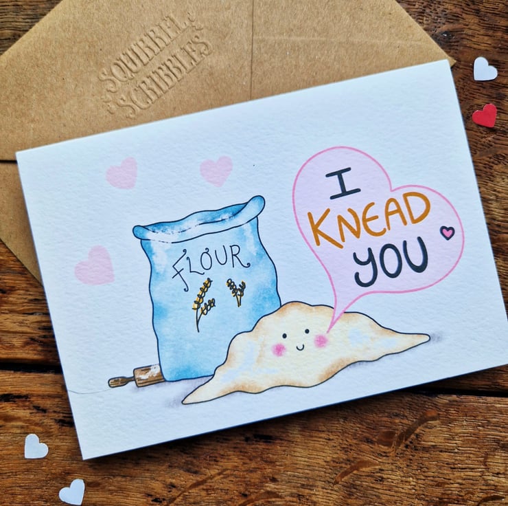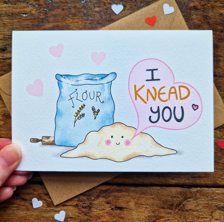 A perfect Valentines day card or anniversary card to show your loved one how much you 'knead' them! This adorable A6 card is handprinted on textured card and glittered by hand.
