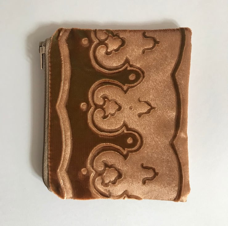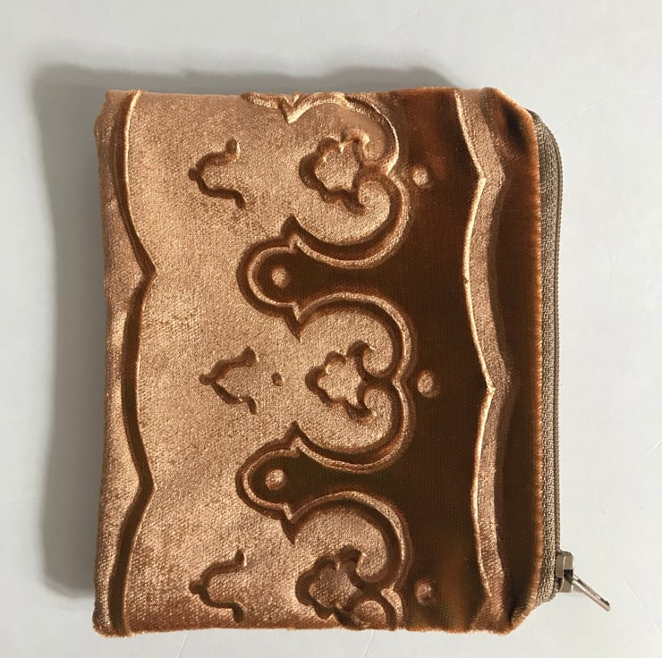 Gold small pouch purse with embossed velvet border and linen design and zip top.