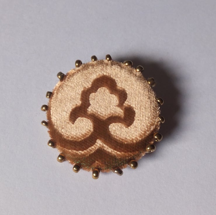Gold embossed design velvet brooch with gold hand beading to edge, felt back and brooch pin fastening.