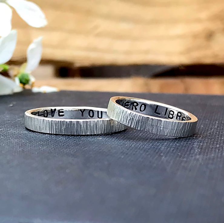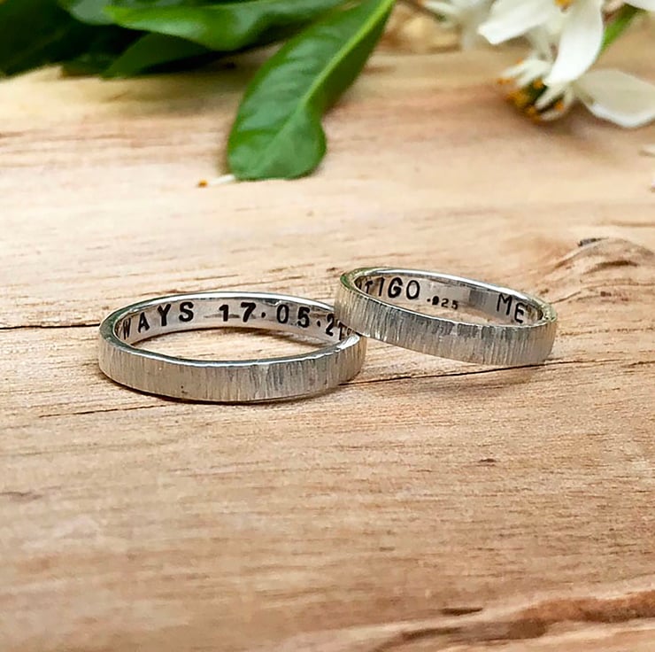 The letters are individually hand stamped into the silver in a simple uppercase font. You are able to choose up to 30 characters of wording inside the ring such as a date, set of names or a short phrase.