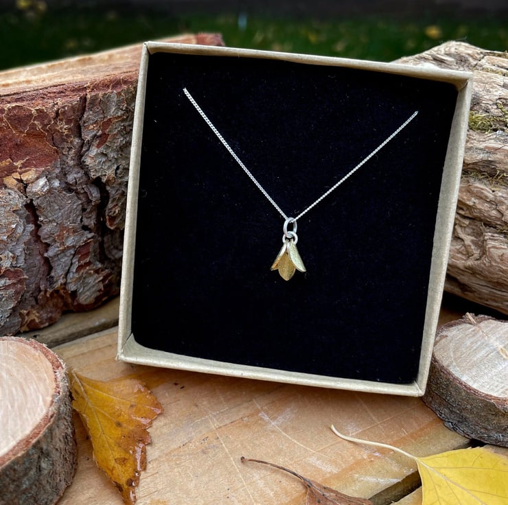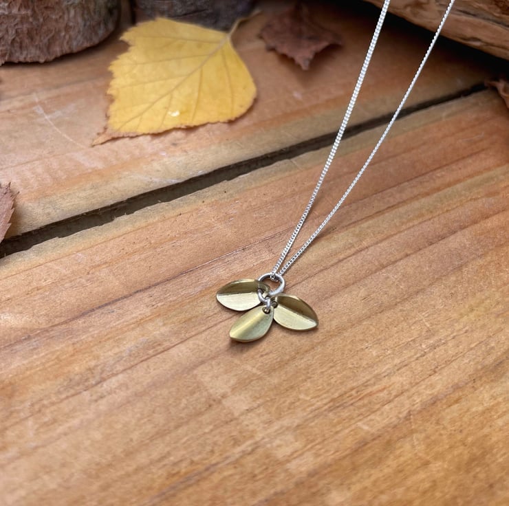 The pendant is created from three tiny petals of brass which hang together, dancing beautifully when worn. The petals are finished with a frosted effect on the outside giving the design a contemporary feel.