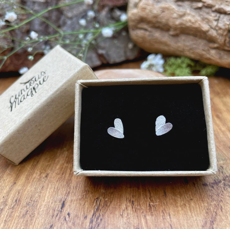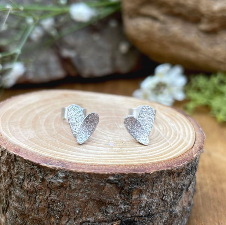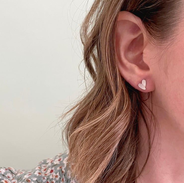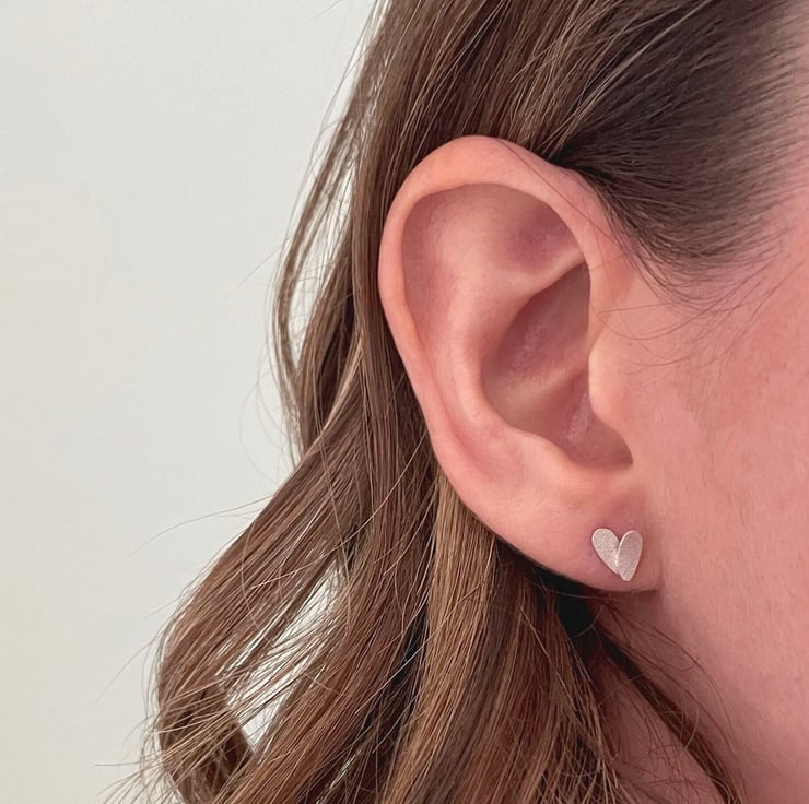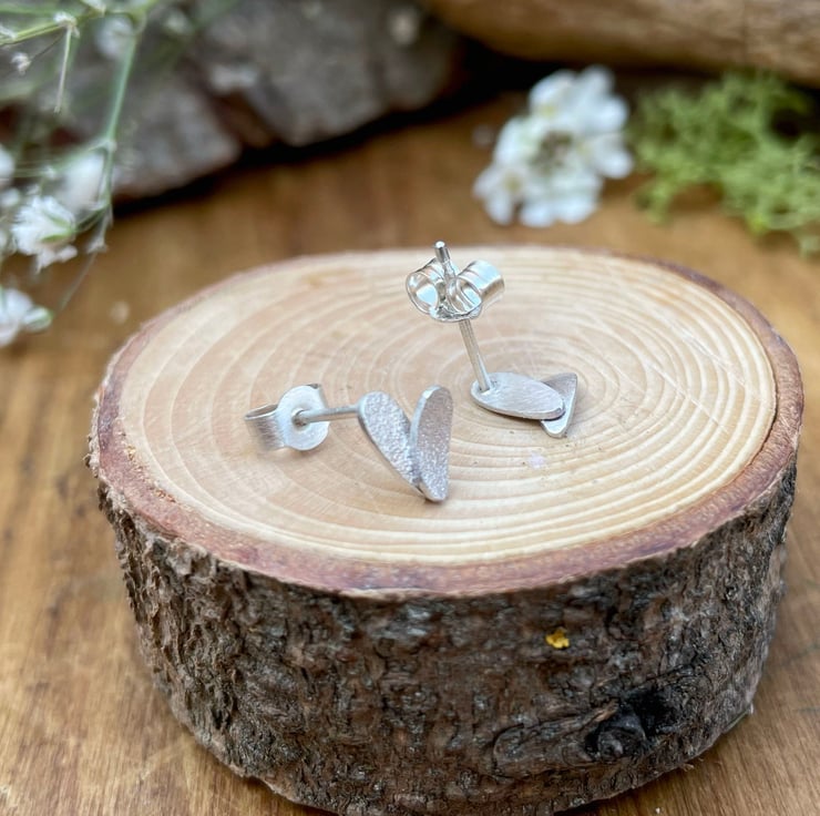 These delicate little stud earrings are inspired by petals from a daisy and handcrafted from .925 sterling silver. The earrings feature two tiny petals soldered together to create a heart shape.