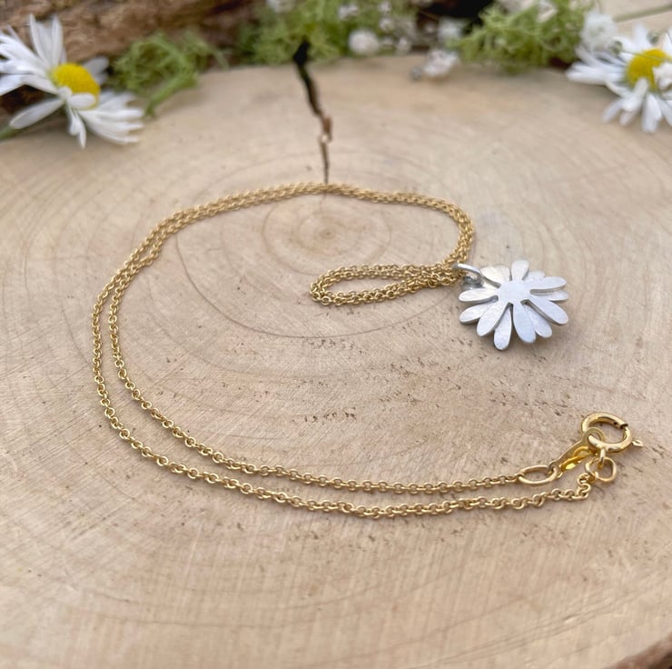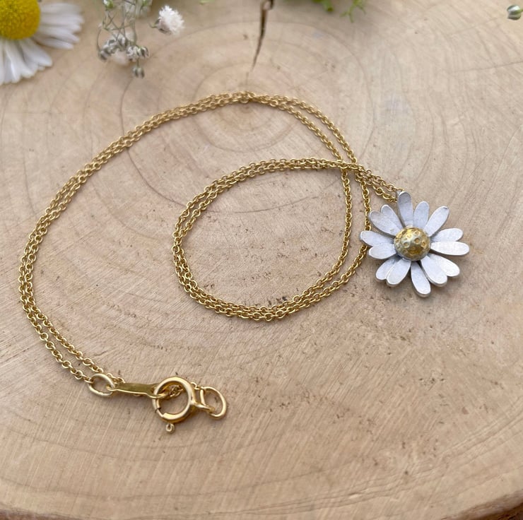 Inspired by wildflower daisy meadows this floral necklace is crafted from sterling silver and features a 24ct yellow gold accent centre. The daisy pendant is attached to a delicate gold chain which can be made in either an 18inch or 16inch length.