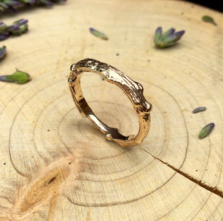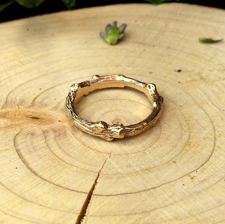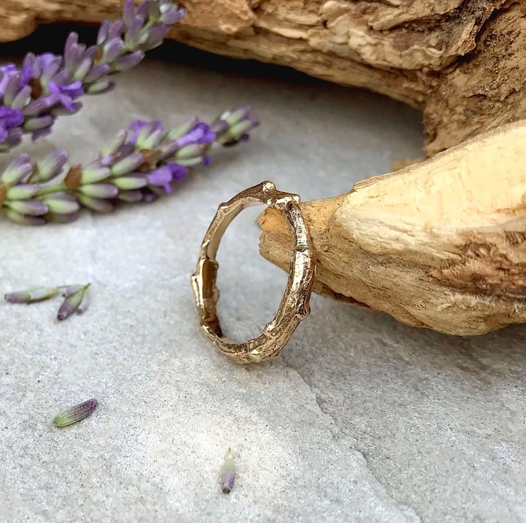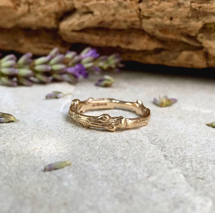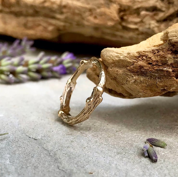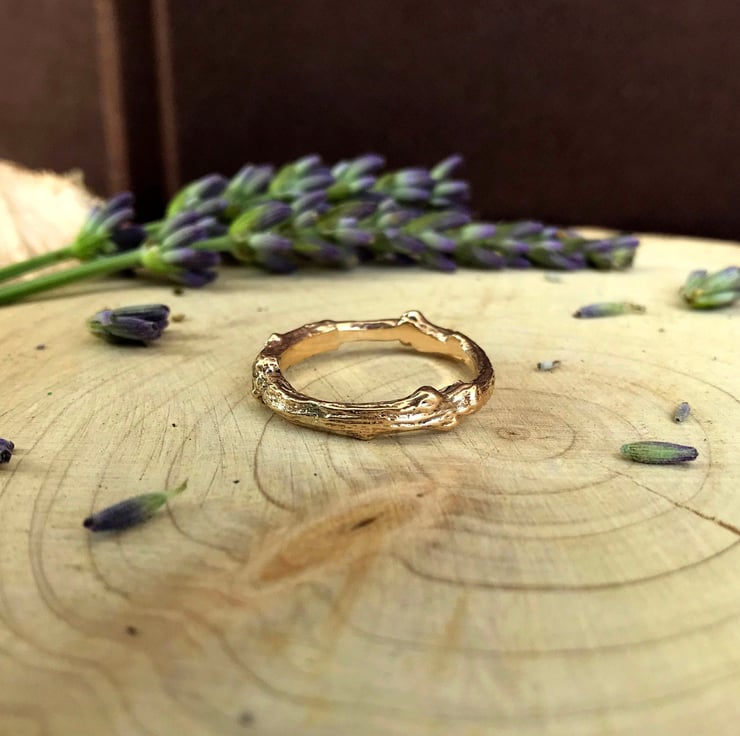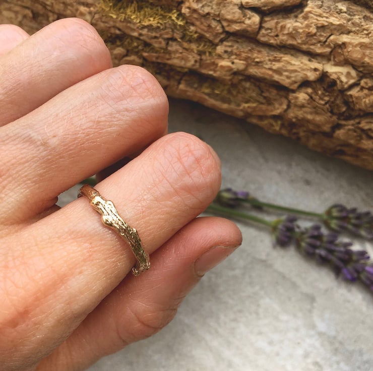 This rustic and unusual 9ct yellow gold ring is created from a cast of a real twig. The twig is transformed into a solid gold copy using the ancient technique of Lost Wax Casting. This process captures the intricate detail and texture of the twig, which is then formed and shaped into a beautiful ring.
