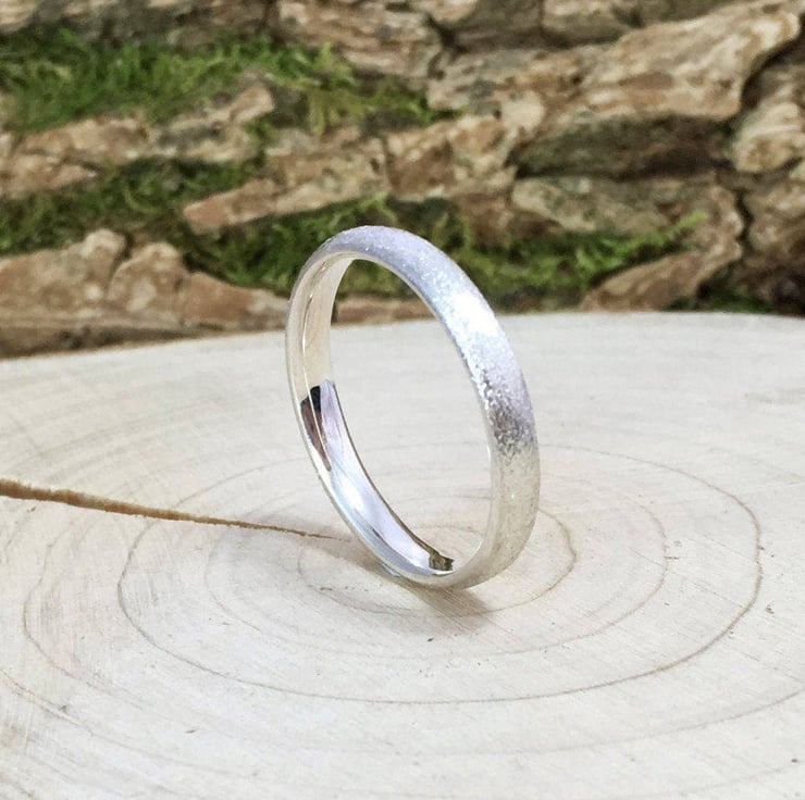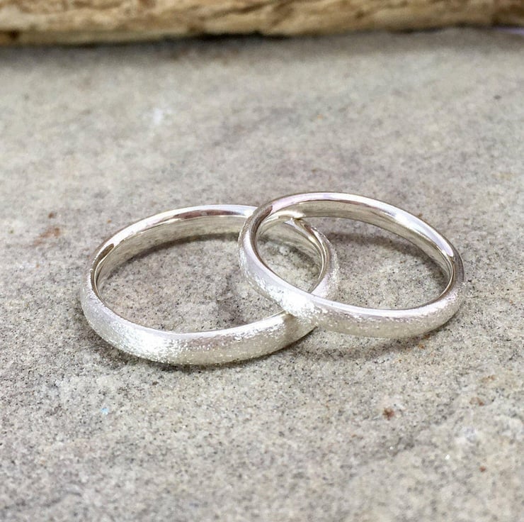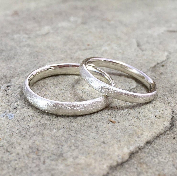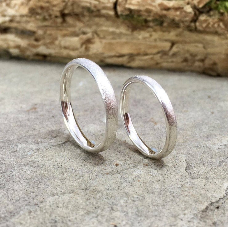 Handcrafted from sterling silver these halo style wedding rings make the perfect contemporary alternative to traditional wedding or commitment bands. Both rings are crafted with a frosted, matte finish in a court shape,meaning that they have a curved edge on the inside and on the outside. This shape of band is really popular as it is comfortable to wear everyday.