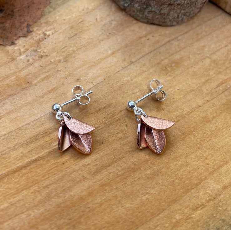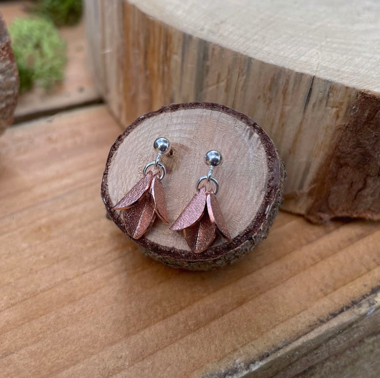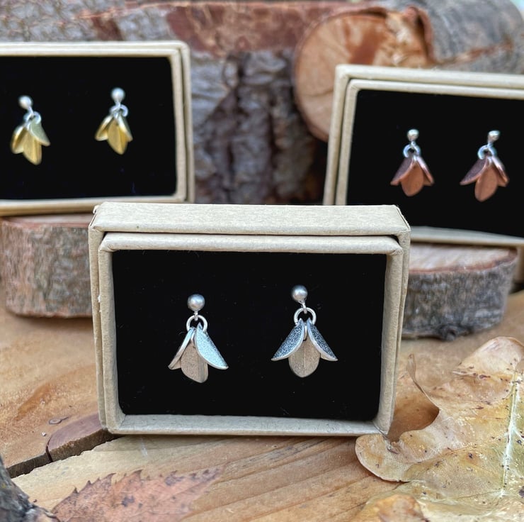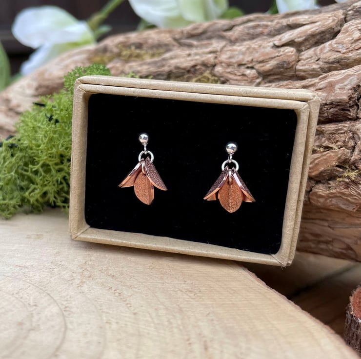 These delicate, handcrafted copper bluebell earrings and finished with a contemporary frosted effect and are completed with .925 sterling silver ball stud earring fittings.