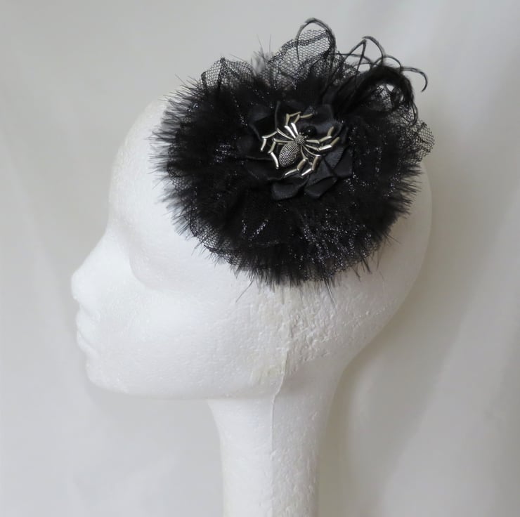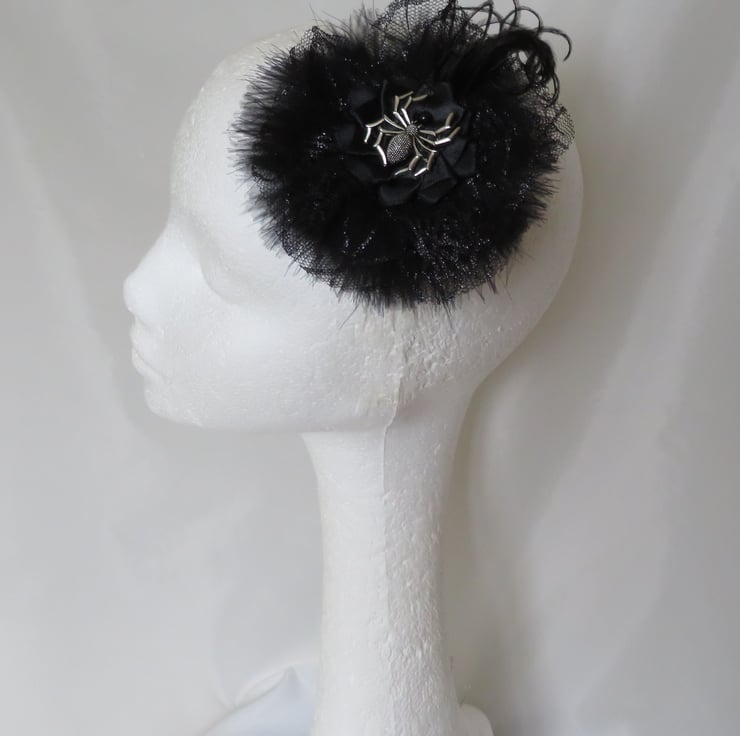 Created with trimmed black fluff feathers, gathered black cobweb tulle and ostrich curled fronds.
