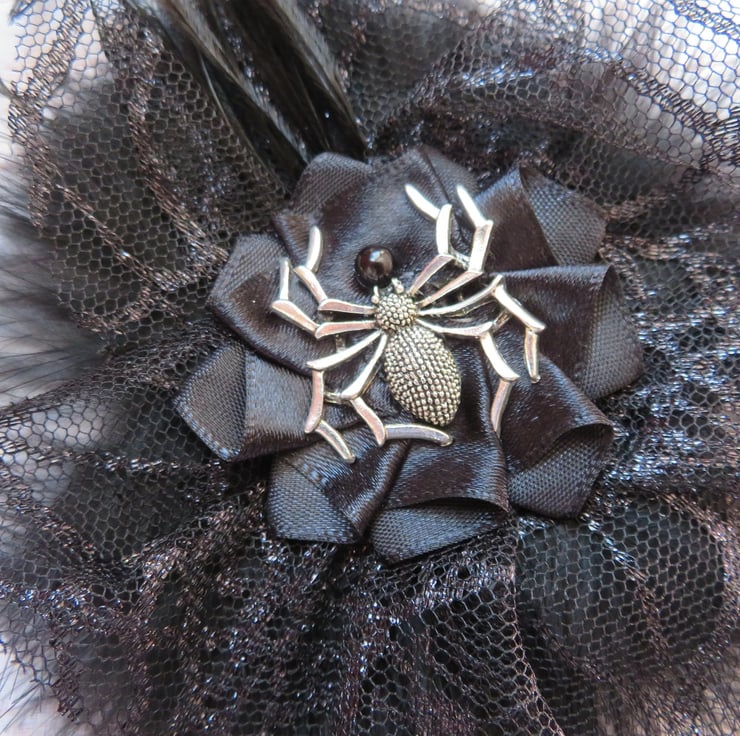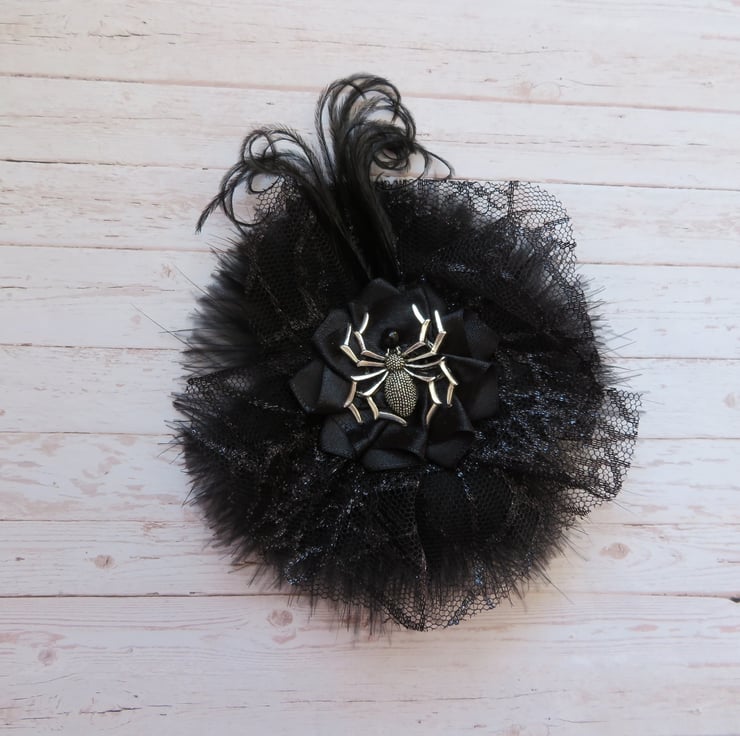 Finished with a black satin ribbon ruffle with a silver spider charm