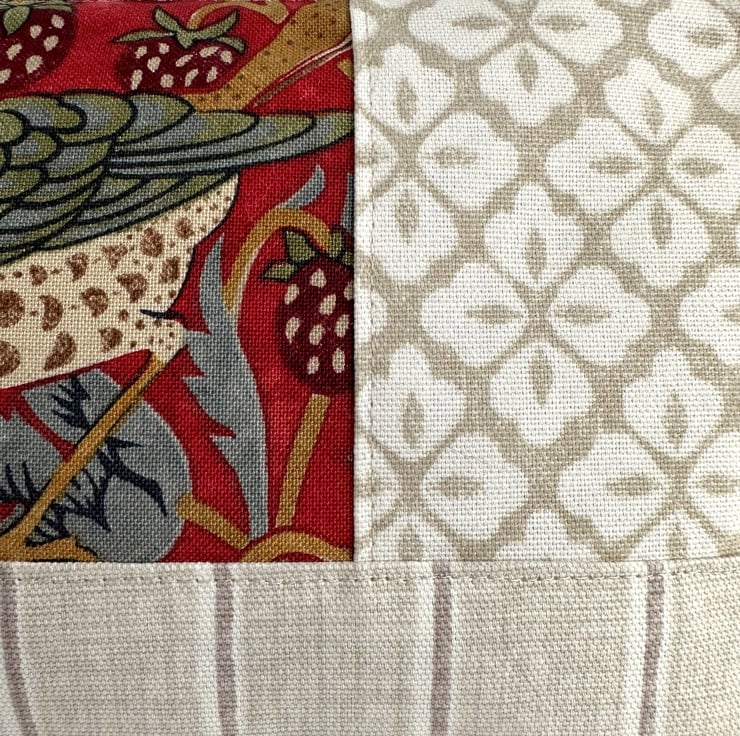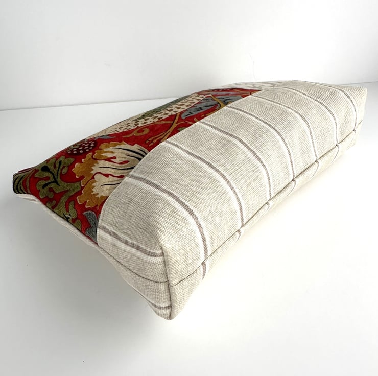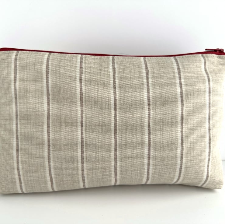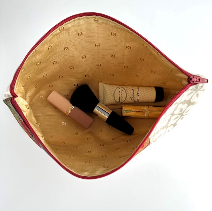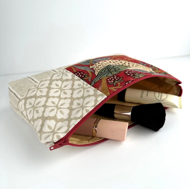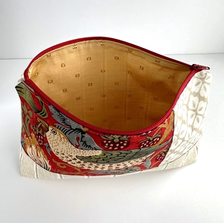 This useful large sized make up bag is made from three lovely co-ordinating print fabrics. The front of the cosmetic bag has three panels. The main feature is a panel of William Morris Strawberry Thief fabric. This shows a thrush, with a strawberry in its beak, sitting amongst strawberries, flowers and foliage. The pattern is depicted in shades of cream, beige, golden brown, olive green, grey and burgundy, on a red background. I've teamed this fabric with a beige fabric with a geometric repeating pattern of white four petaled flowers, and with a creamy beige fabric with narrow taupe and white stripes. The striped fabric also makes up the back of the cosmetic bag. The make up bag fastens with a matching red zip and is lined with golden yellow fabric with a woven pattern of small squares. The base of the bag is boxed giving lots of space inside.