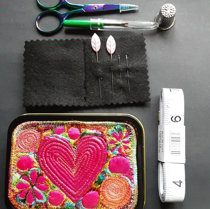 This is a handmade, machine stitched cover for a sewing supplies tin.