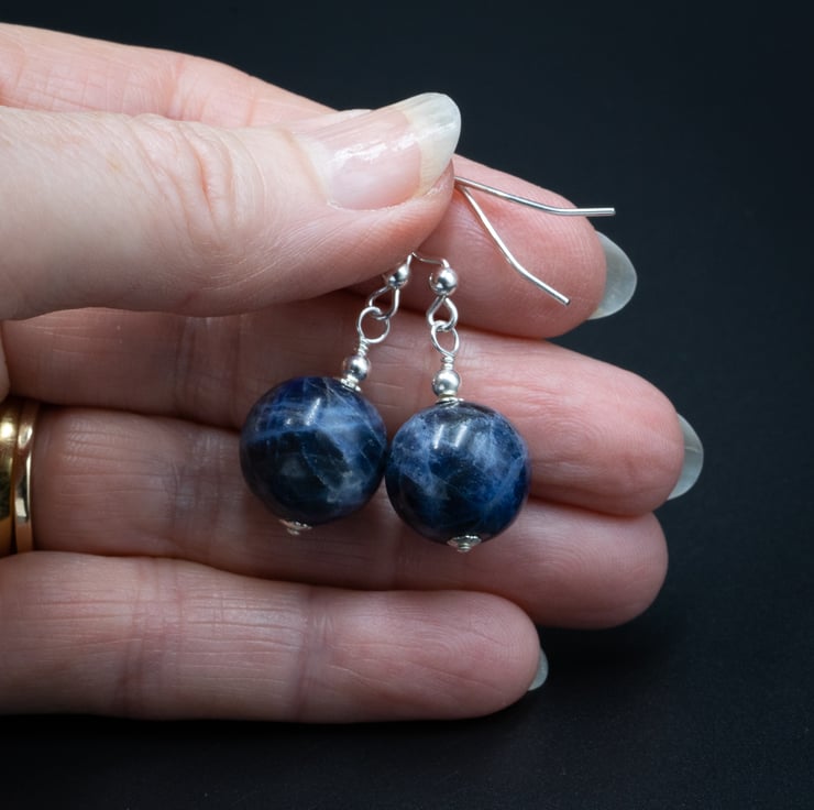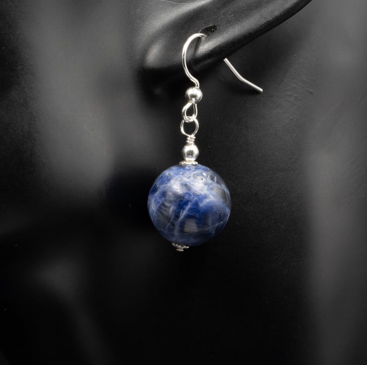 These earrings are made with 14mm smooth round denim blue beads which are topped and tailed with sterling silver bead caps and a bead at the top. The drops hang from a pair of sturdy sterling silver hooks .
