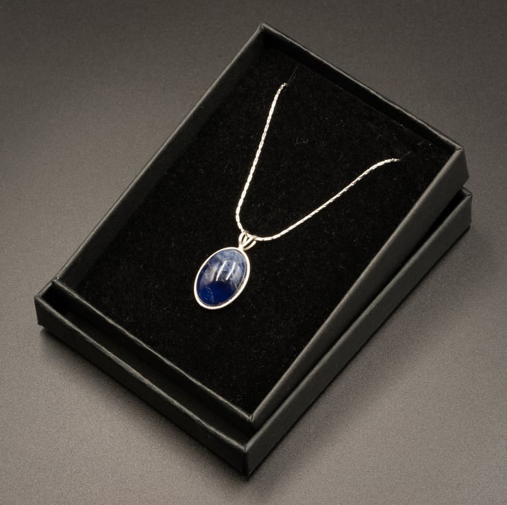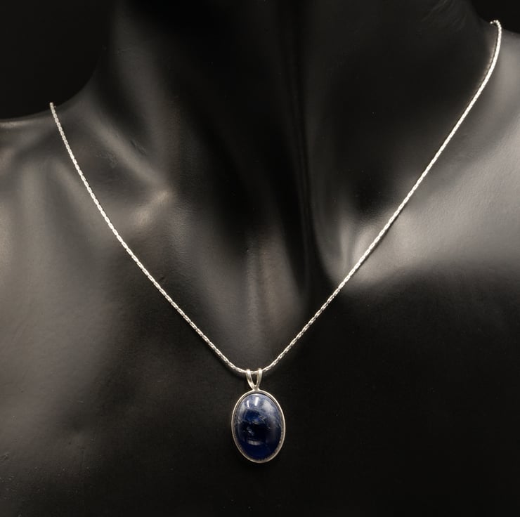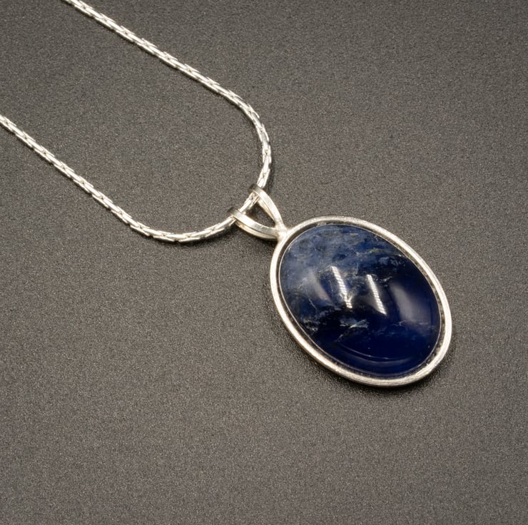 A lovely denim blue sodalite cabochon is set in a sterling silver pendant mount and hangs from a sterling silver slinky cardano chain.