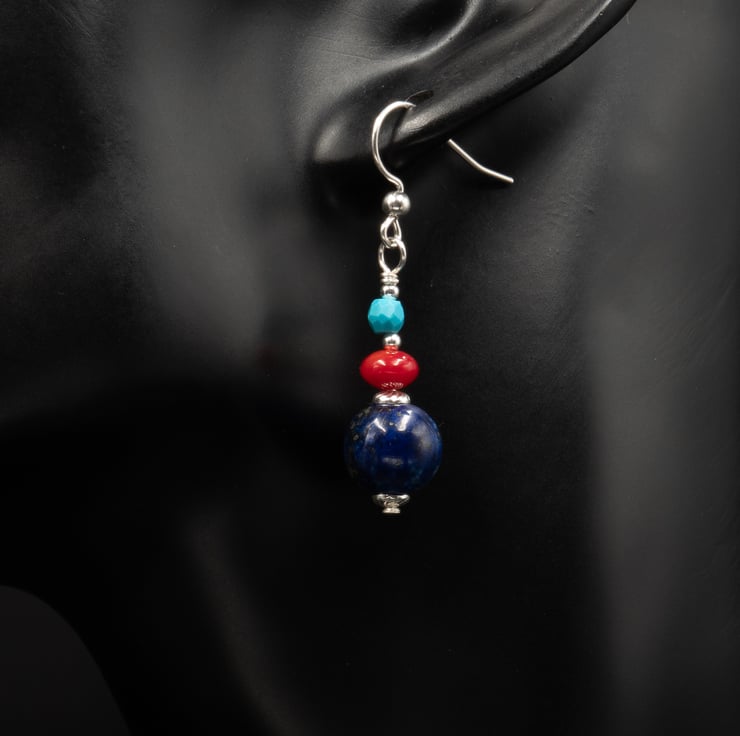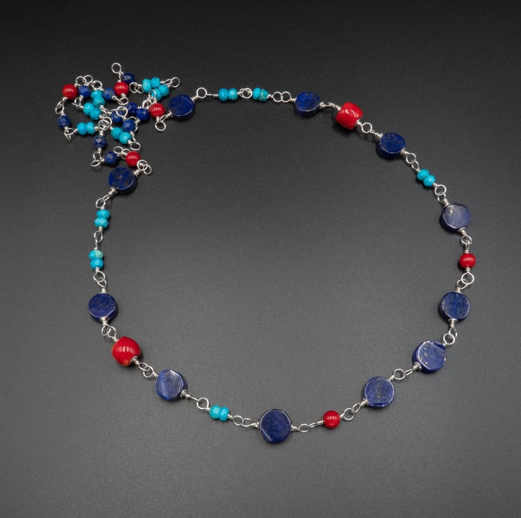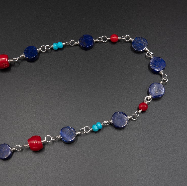 9mm flat coins of Lapis Lazuli, rondelles and 4mm rounds of bright red Coral and 3mm faceted turquoise beads are mixed with sterling silver beadcaps for this colourful necklace. Each bead is hand linked with sterling silver wire to form the necklace chain.