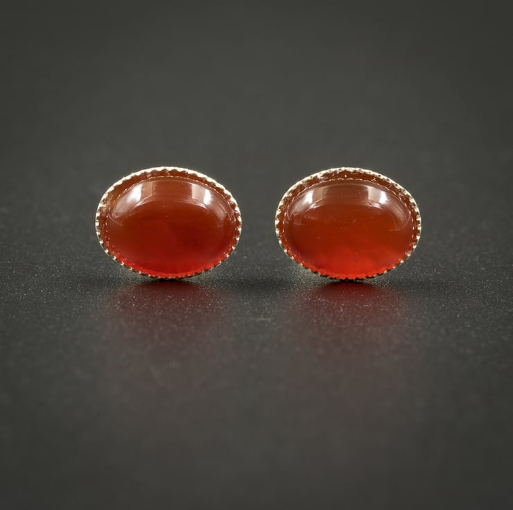 6 x 8mm oval natural carnelian cabochon stones are mounted into a solid sterling silver mill edged mount with a butterfly clip to secure. A lovely burnt orange shade.