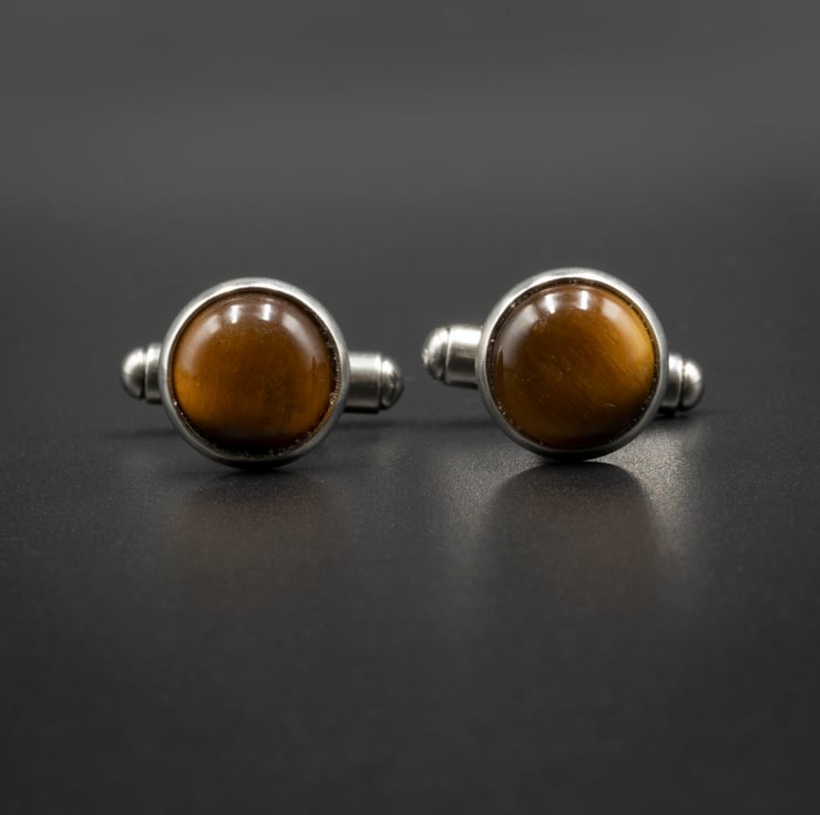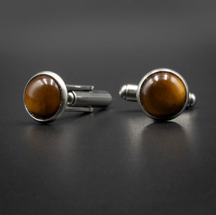 Deep gold 10mm Tiger eye stones are set into a pair of strong stainless steel cufflink mounts.