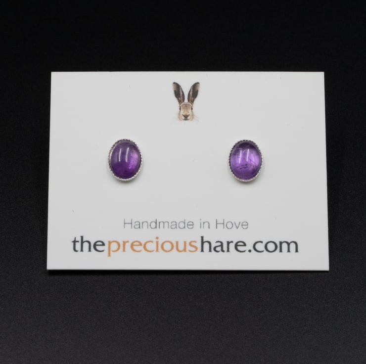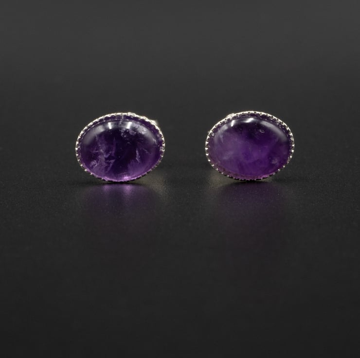 Gorgeous deep purple amethyst cabochon stones are mounted into a solid sterling silver mill edged mount with a butterfly clip to secure. Stones measure 8 x 6mm.