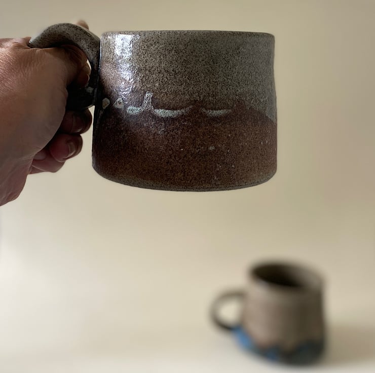 Warm blues and greens feature on the smaller cup. The larger has an almost volcanic surface of mainly browns and a sprinkling of blues.