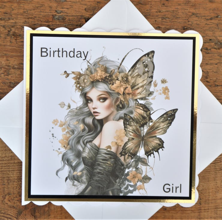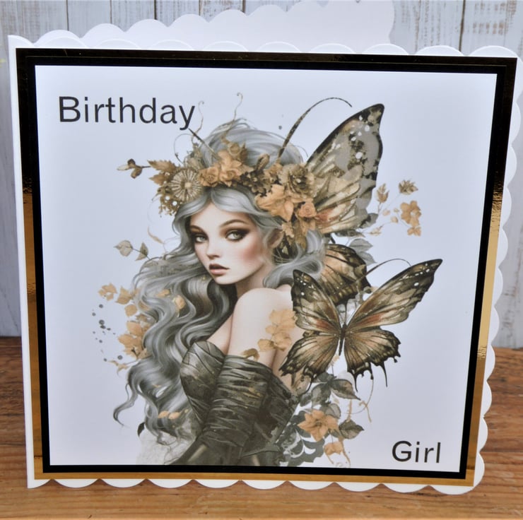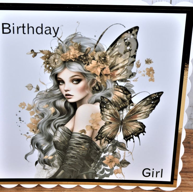 A lovely birthday card made from 300gsm white scalloped card. Printed the image onto white card, added a sentiment and layered up onto black and gold mirri card to complete.