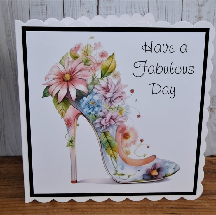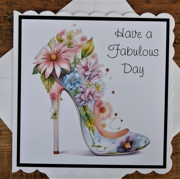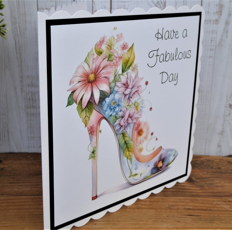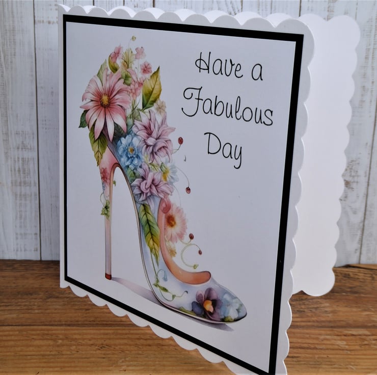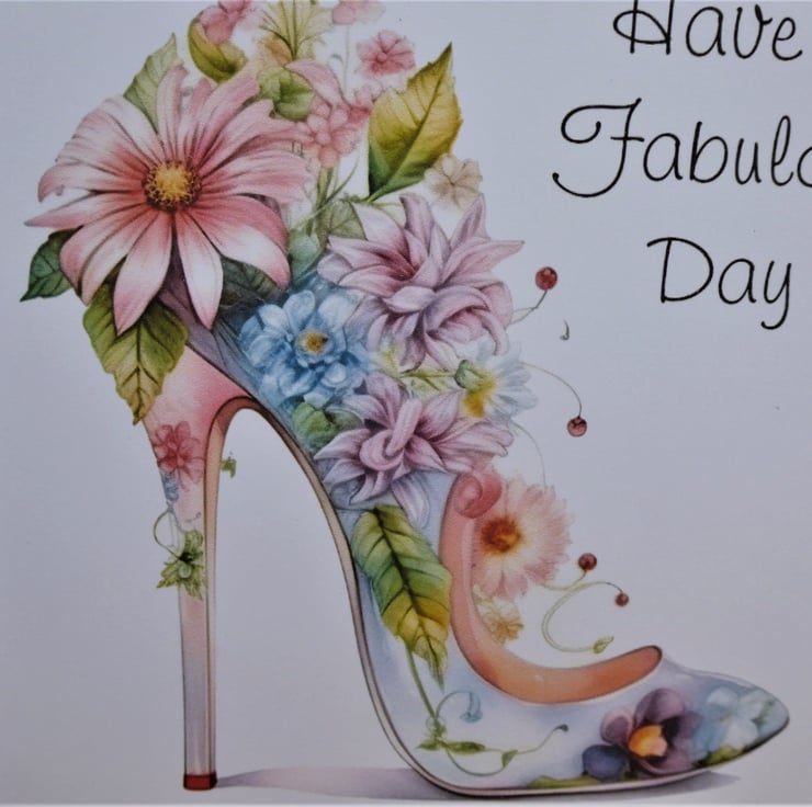 This birthday card made from 300gsm white scalloped card has a lovely image of a shoe covered in flowers, very pretty.