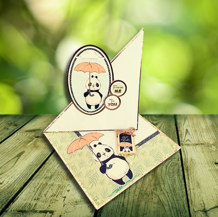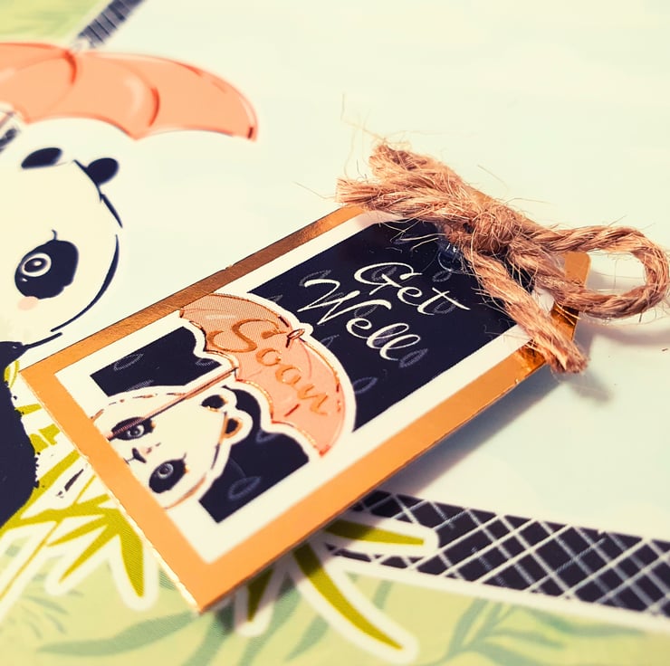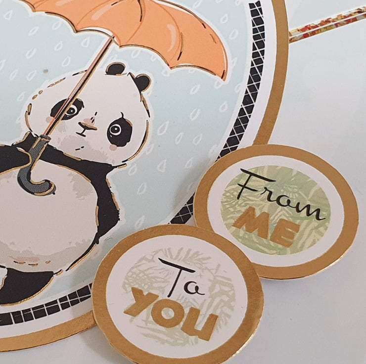 The front of the card has been separated in two equal triangles, to form an easel when on display. It is decorated with an oval gold foiled topper, displaying the Panda under the umbrella, accompanied by two small round toppers, with the words “From ME” & “To YOU”. On the inside of the card, a raised tag with the sentiment “Get Well Soon”, embellished with a small bow made of natural twine, will act as the stopping point for the easel.