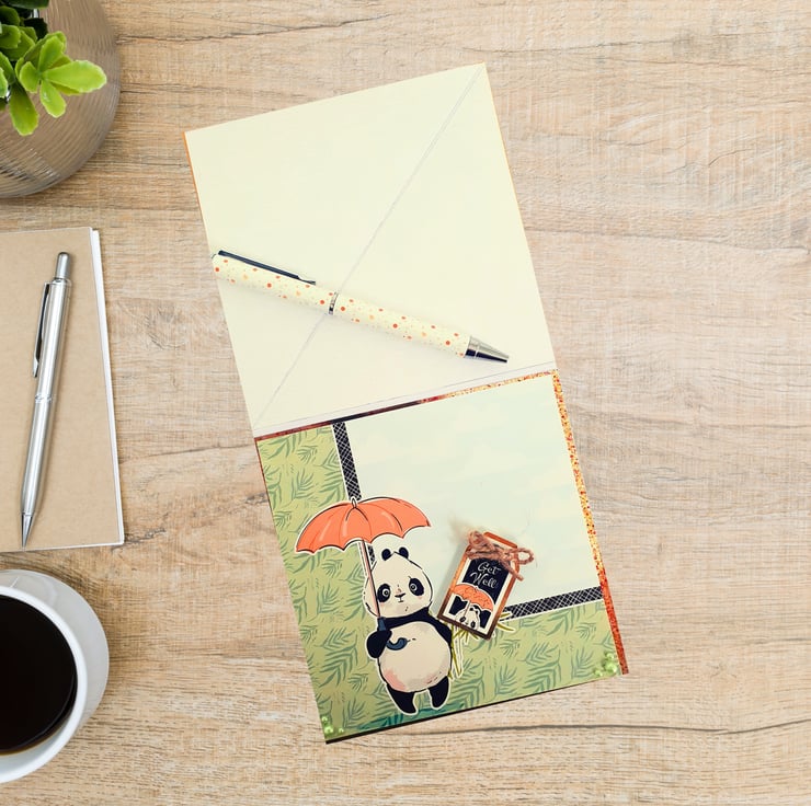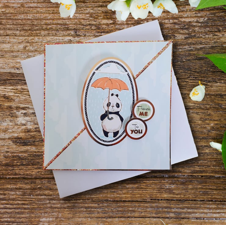 “Get well soon!” Twisted easel card, handmade using the Hunkydory “Happy Panda” Luxury Card Collection. Featuring a Panda holding an umbrella in the rain, this card is perfect for sending your “well wishes” to anyone who needs them!