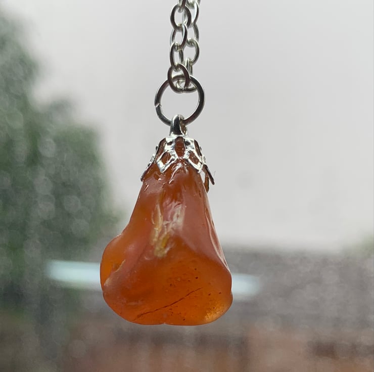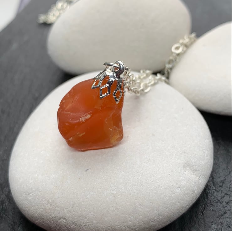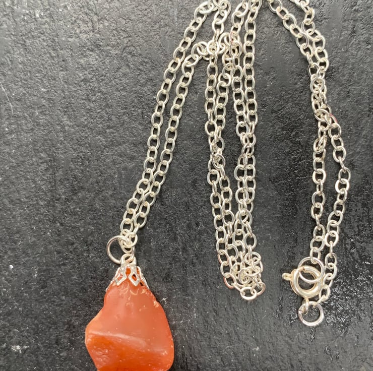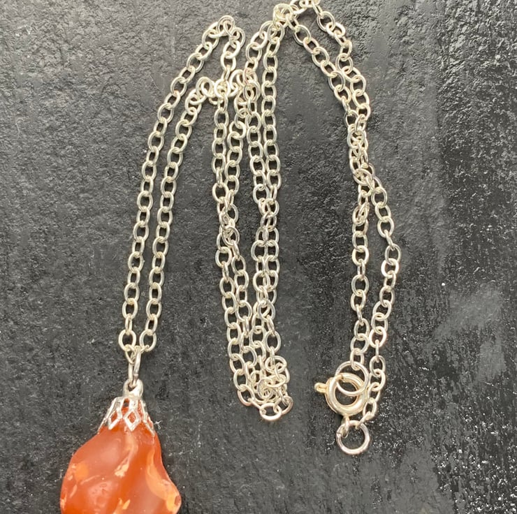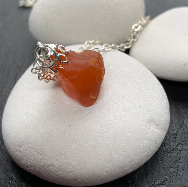 This almost pyramid shaped piece of carnelian, collected from Withernsea beach in East Yorkshire, is fixed to a silver plated ring and filigree cap to form a drop approx 2.5cm in length. The carnelian has not been polished or changed in shape in any way. The silver plate chain measures 20 inches.